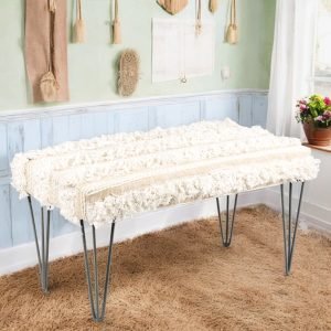 Velas Sheesham Wood Mid Century 2 Seater Bench with Metal Legs in Beige Fabric with Fringes