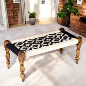 Oakville Sheesham Wood Vintage 2 Seater Maachi Bench in Black & White Rope Canning
