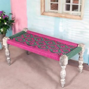 Oakville Sheesham Wood Vintage 2 Seater Maachi Bench in Green & Pink Rope Canning