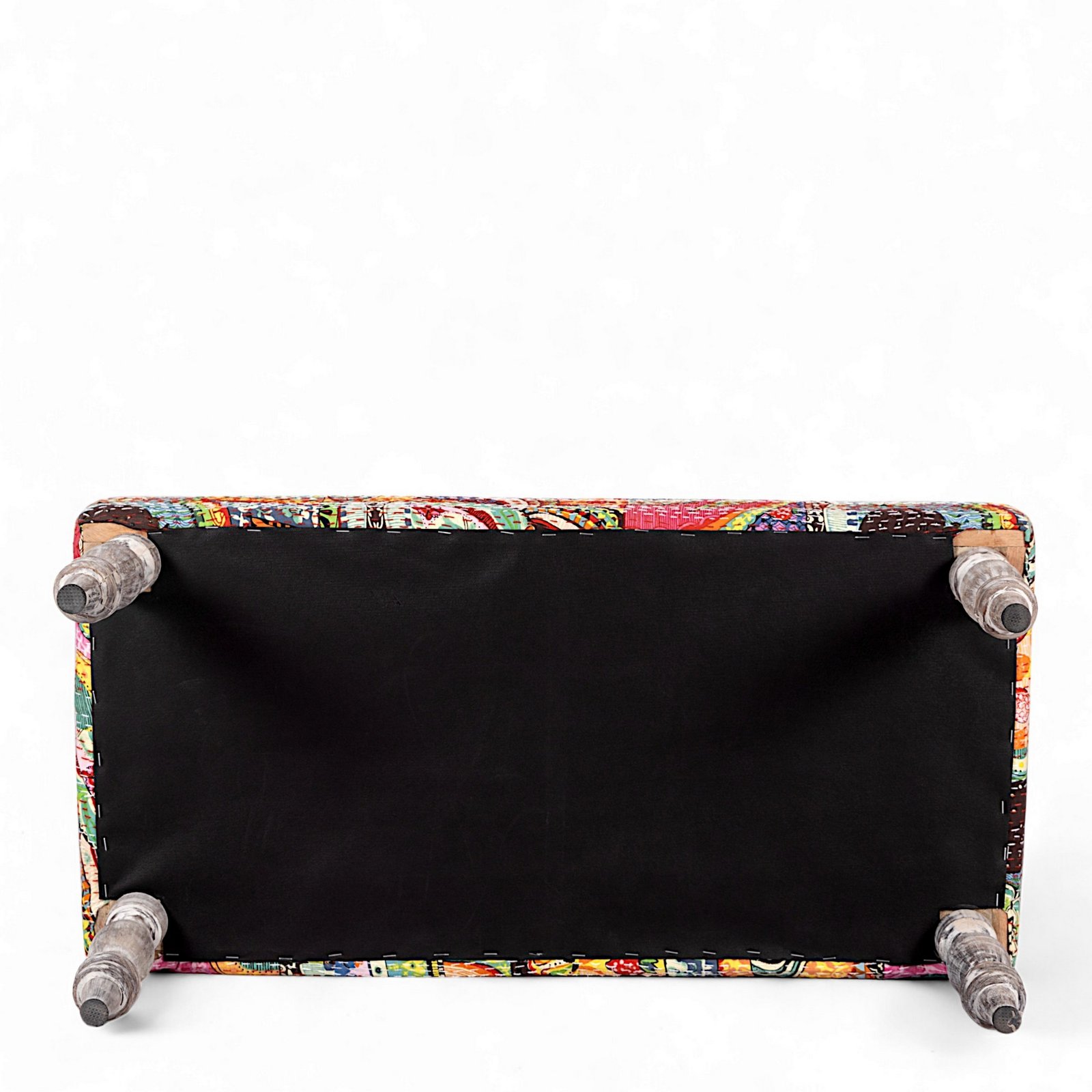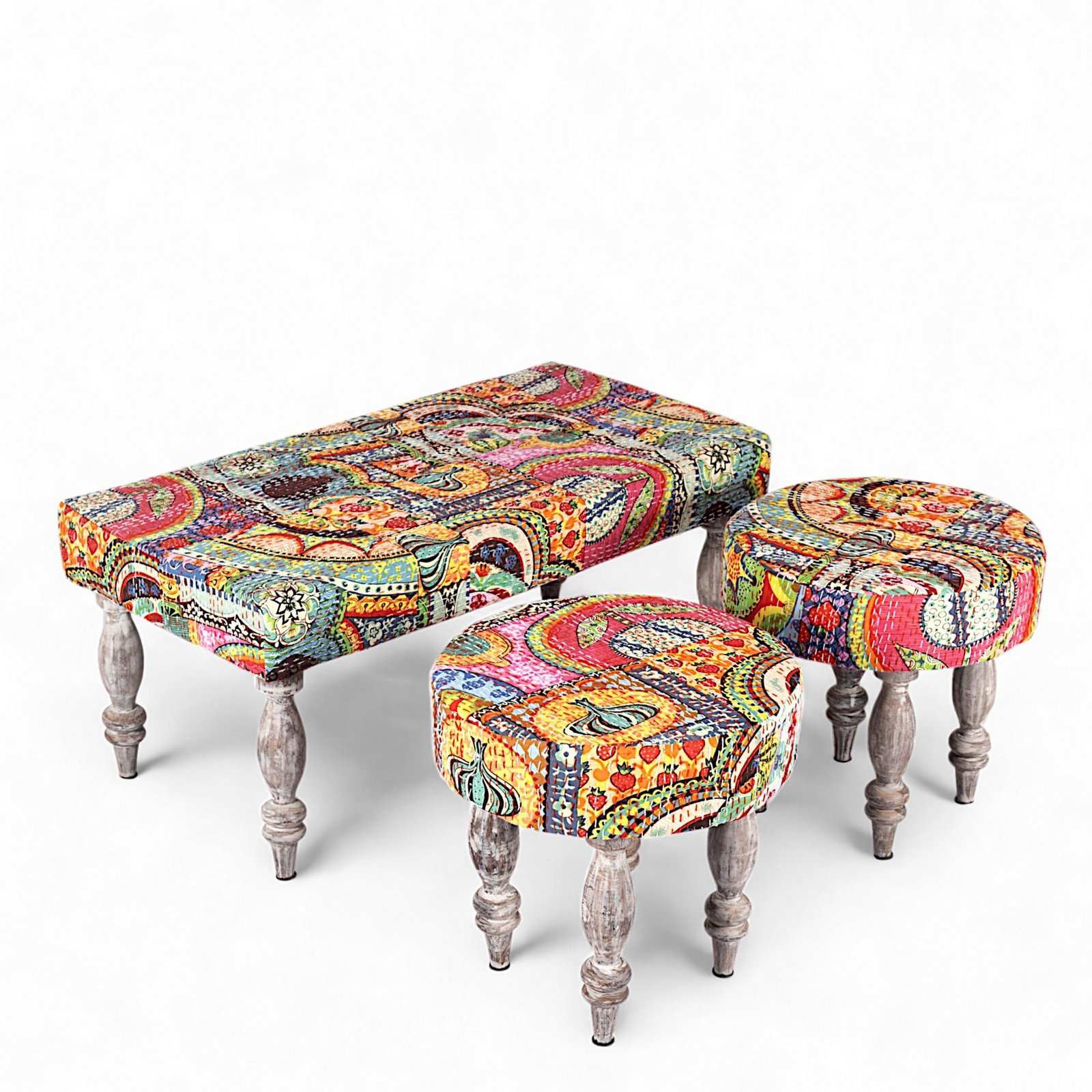 Ikiriya Bestone Sheesham Wood Bohemian 2+1+1 Seater Bench Set with 2 Stools in Israel Print Patchwork Kantha