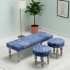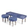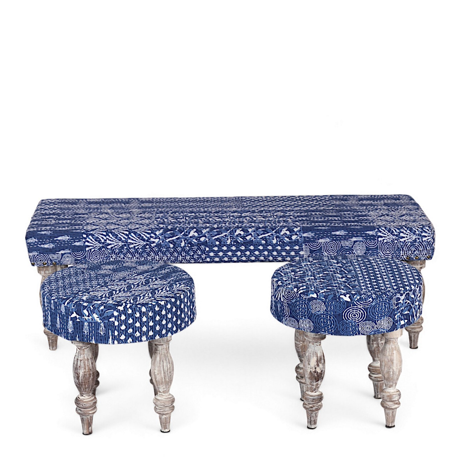 Ikiriya Cairo Sheesham Wood Mid Century 3+1+1 Seater Bench Set with 2 Stools in indigo Patchwork Kantha
