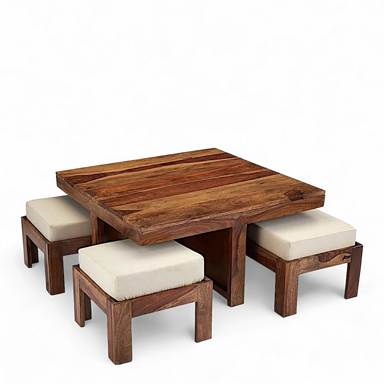 Ikiriya Blane Sheesham Wood Accent Coffee Table Set with 4 Stools in Natural Teak Finish with Jute White Cushions