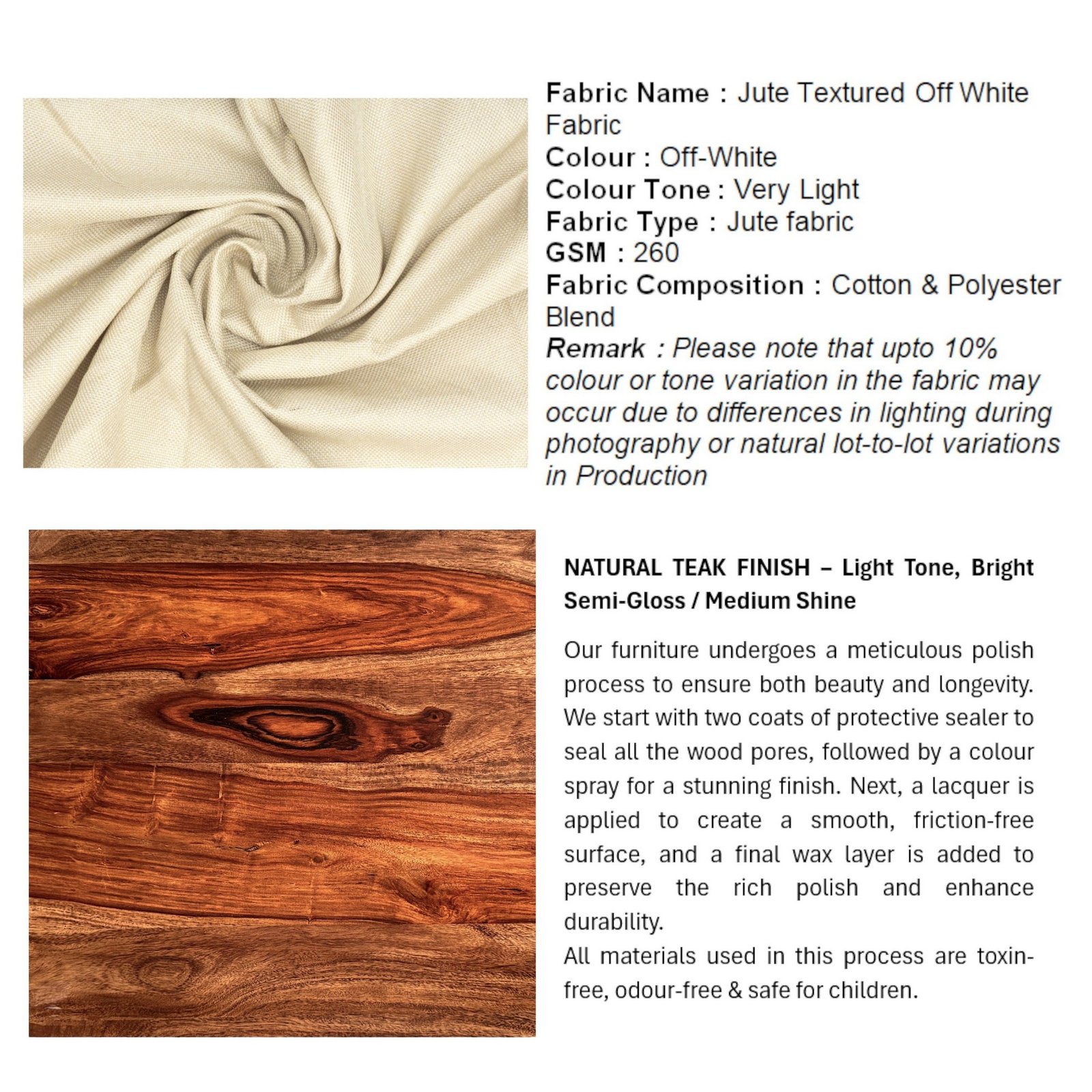 . Wood Finish: NATURAL TEAK FINISH ??? Light Tone, Bright Semi-Gloss / Medium Shine