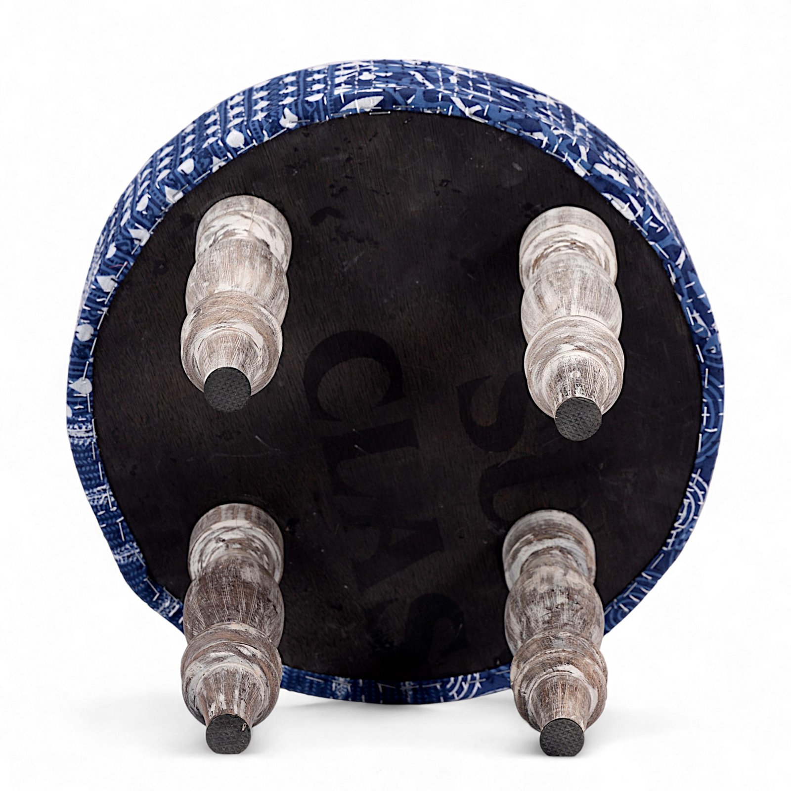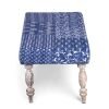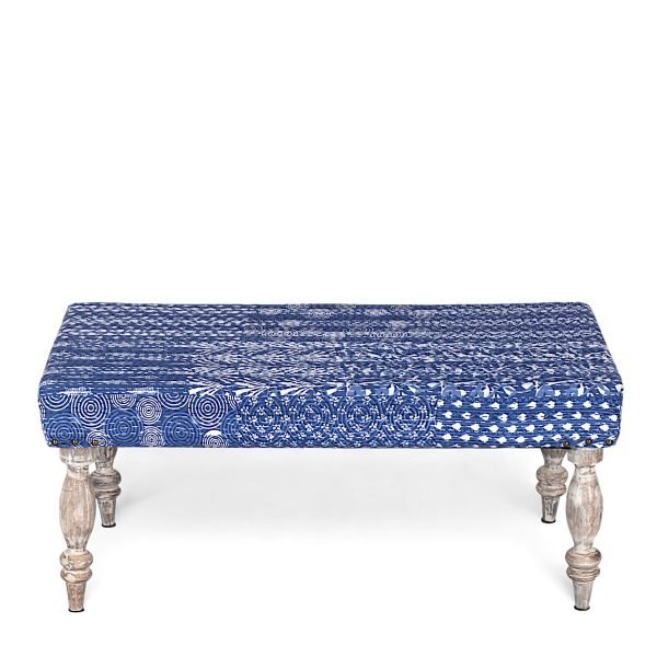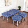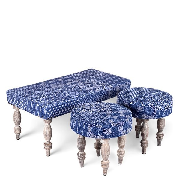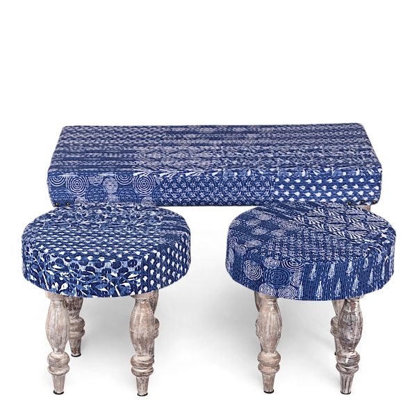 Bestone Sheesham Wood Mid Century 2+1+1 Seater Bench Set with 2 Stools in Indigo Patchwork Kantha