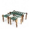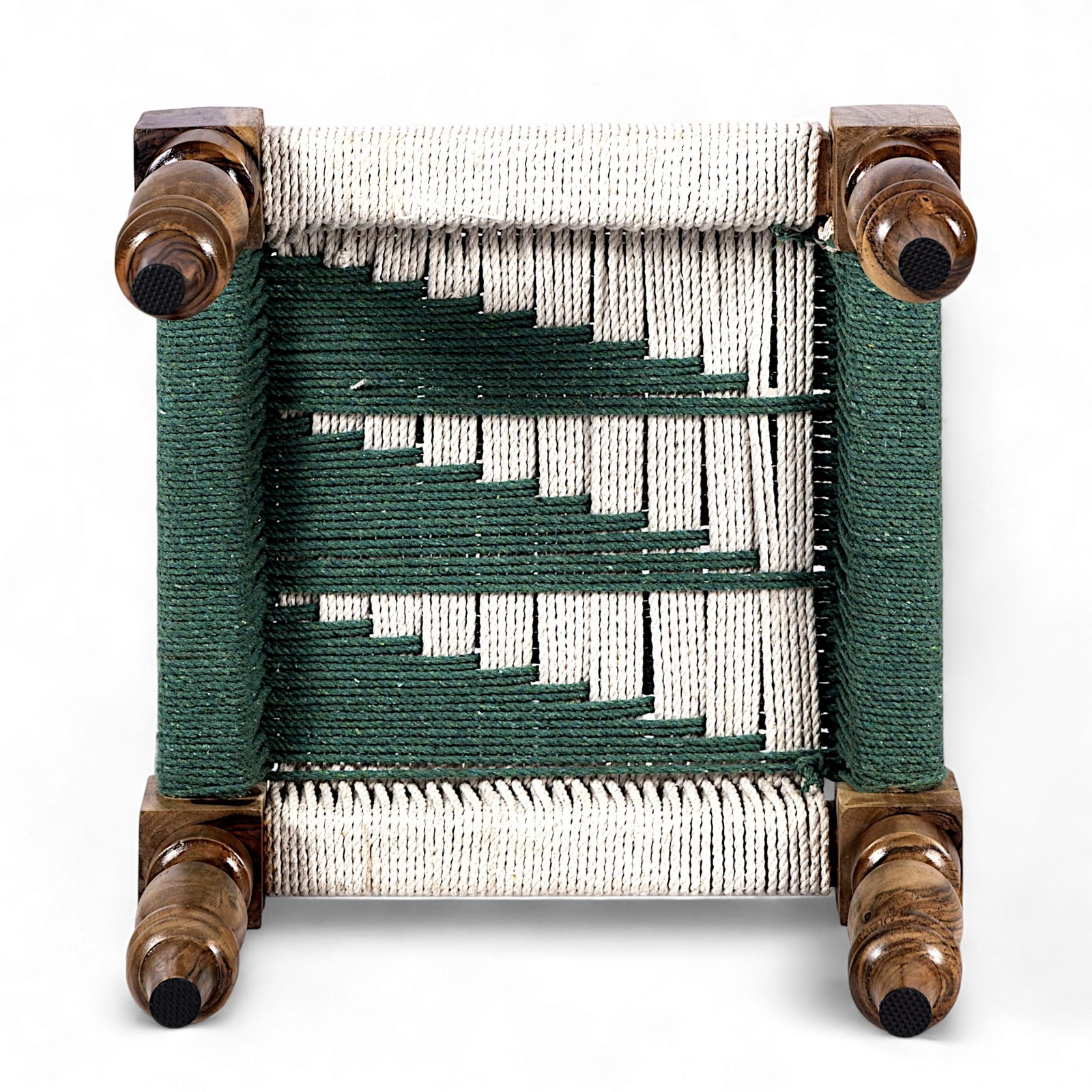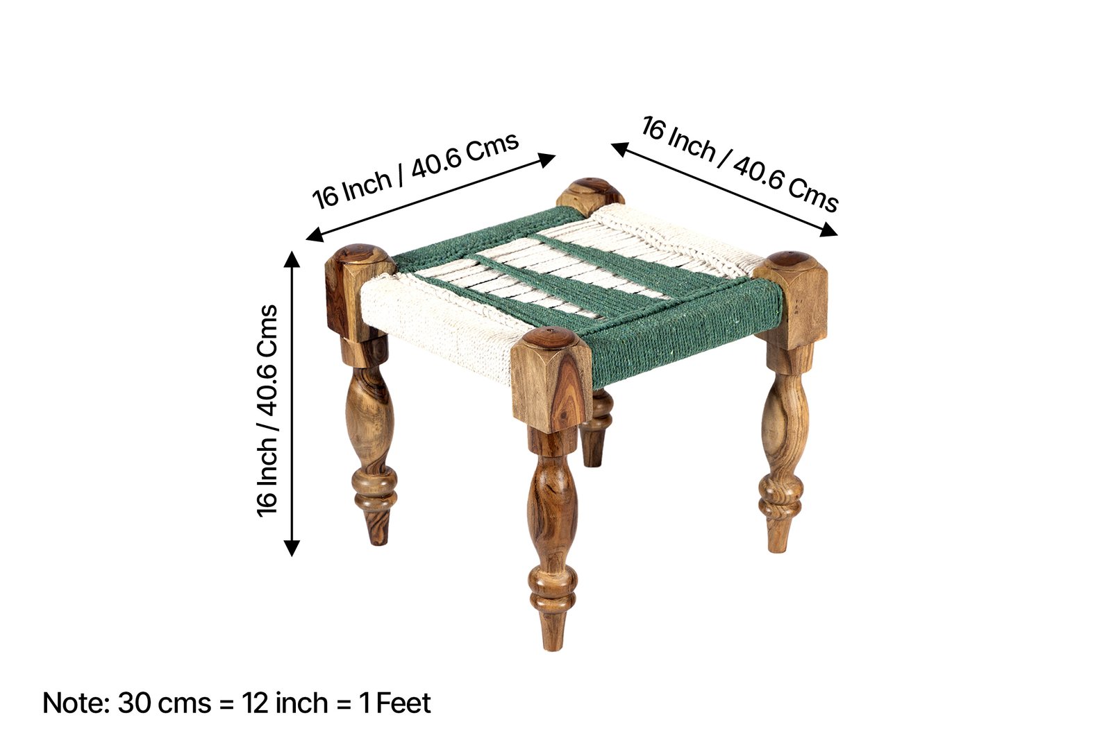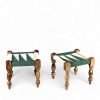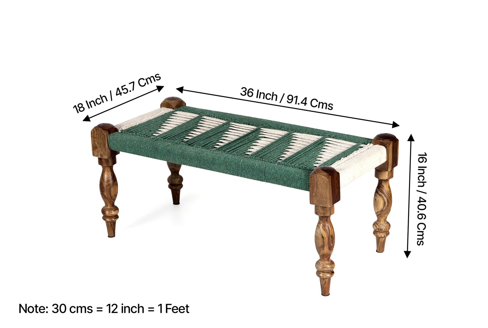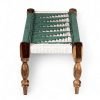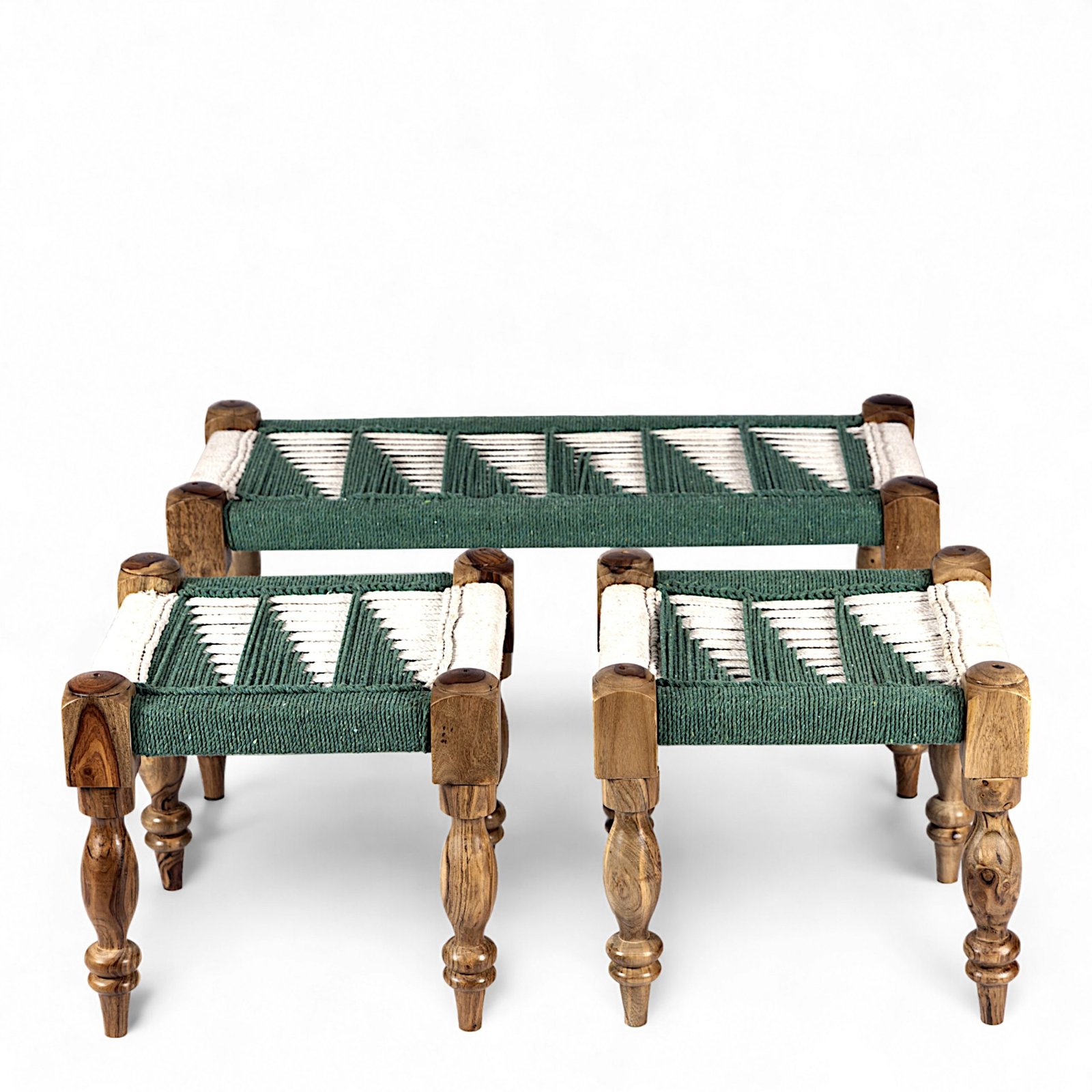 Oakville Sheesham Wood Vintage 2+1+1 Seater Maachi Bench Set with 2 Stools in Green & White Rope Canning