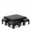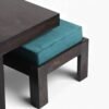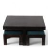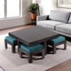 Ikiriya Blane Sheesham Wood Accent Coffee Table Set with 4 Stools in Dark Mahagony Finish with Turquoise Sea Velvet Cushions