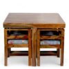 Ikiriya Irish Sheesham Wood Accent Coffee Table Set with 2 Stools in Teak Finish with Beige Sparkle Velvet Cushions