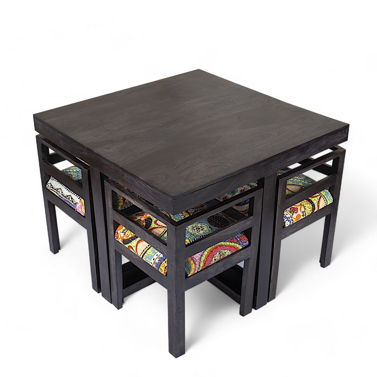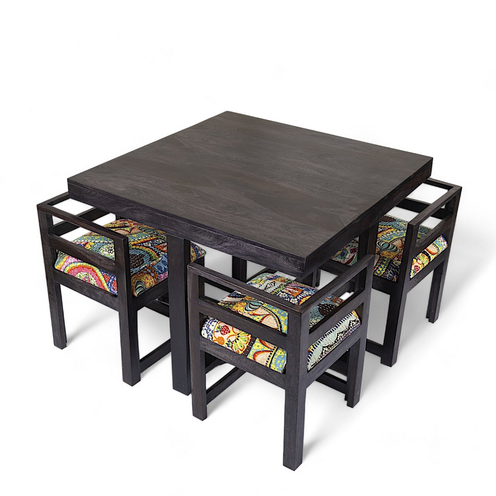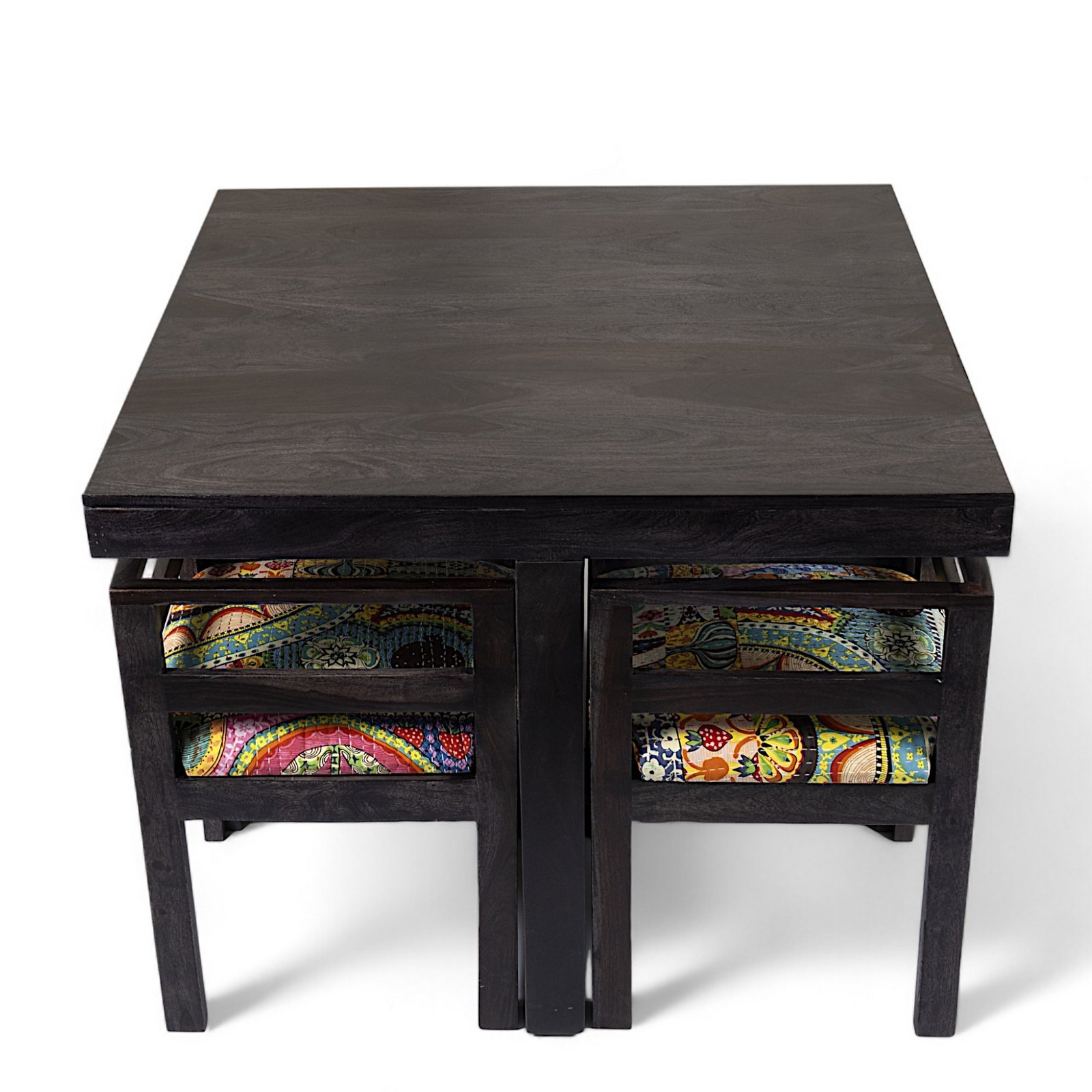 Ikiriya Kingston Sheesham Wood Accent 4 Seater Dining Table Set with Dark Mahagony Finish & Israel Print Patchwork Kantha Cushioning