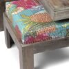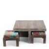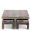 Ikiriya Blane Sheesham Wood Country Side Coffee Table Set with 4 Stools in Antique Grey Finish with Sea Green Fruit Print Kantha Cushions