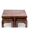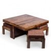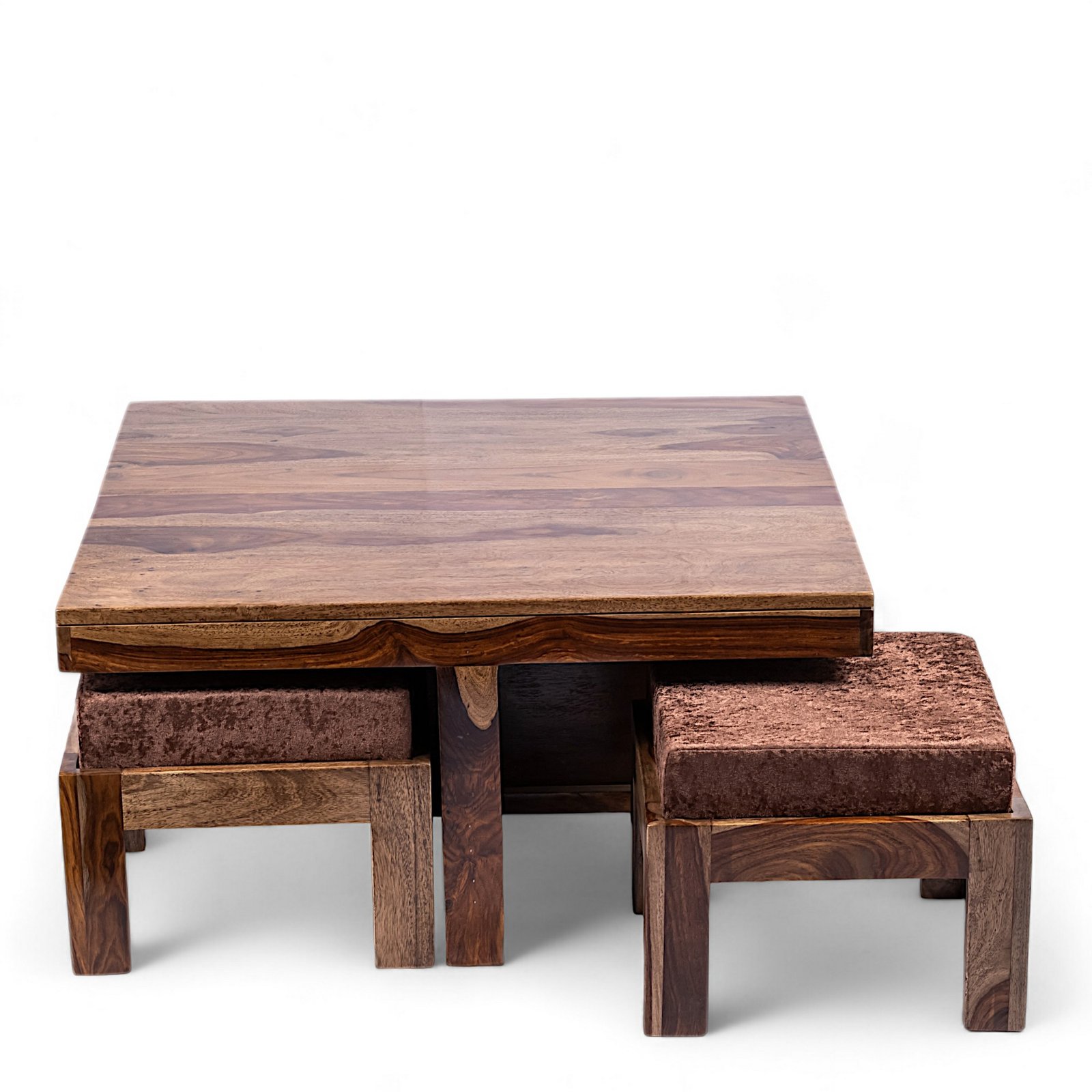 Ikiriya Blane Sheesham Wood Accent Coffee Table Set with 4 Stools in Teak Finish with Caramel Brown Sparkle Velvet Cushions