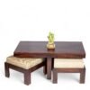 Ikiriya Blane Sheesham Wood Accent Coffee Table Set with 4 Stools in Teak Finish with Beige Sparkle Velvet Cushions