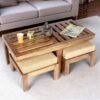 Ikiriya Irish Sheesham Wood Accent Coffee Table Set with 2 Stools in Teak Finish with Jute Beige Cushions