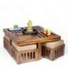 Ikiriya Palladio Sheesham Wood Accent Coffee Table Set with 4 Stools in Teak Finish with Jute Beige Cushions