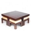Ikiriya Blane Sheesham Wood Accent Coffee Table Set with 4 Stools in Dark Walnut Finish with Beige Sparkle Velvet Cushions