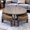 Ikiriya Palladio Sheesham Wood Accent Coffee Table Set with 4 Stools in Teak Finish with Jute Beige Cushions