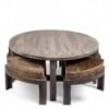 Ikiriya Nashville Sheesham Wood Country Side Coffee Table Set with 4 Stools in Antique Grey Finish with Green Sparkle Velvet Cushions