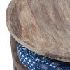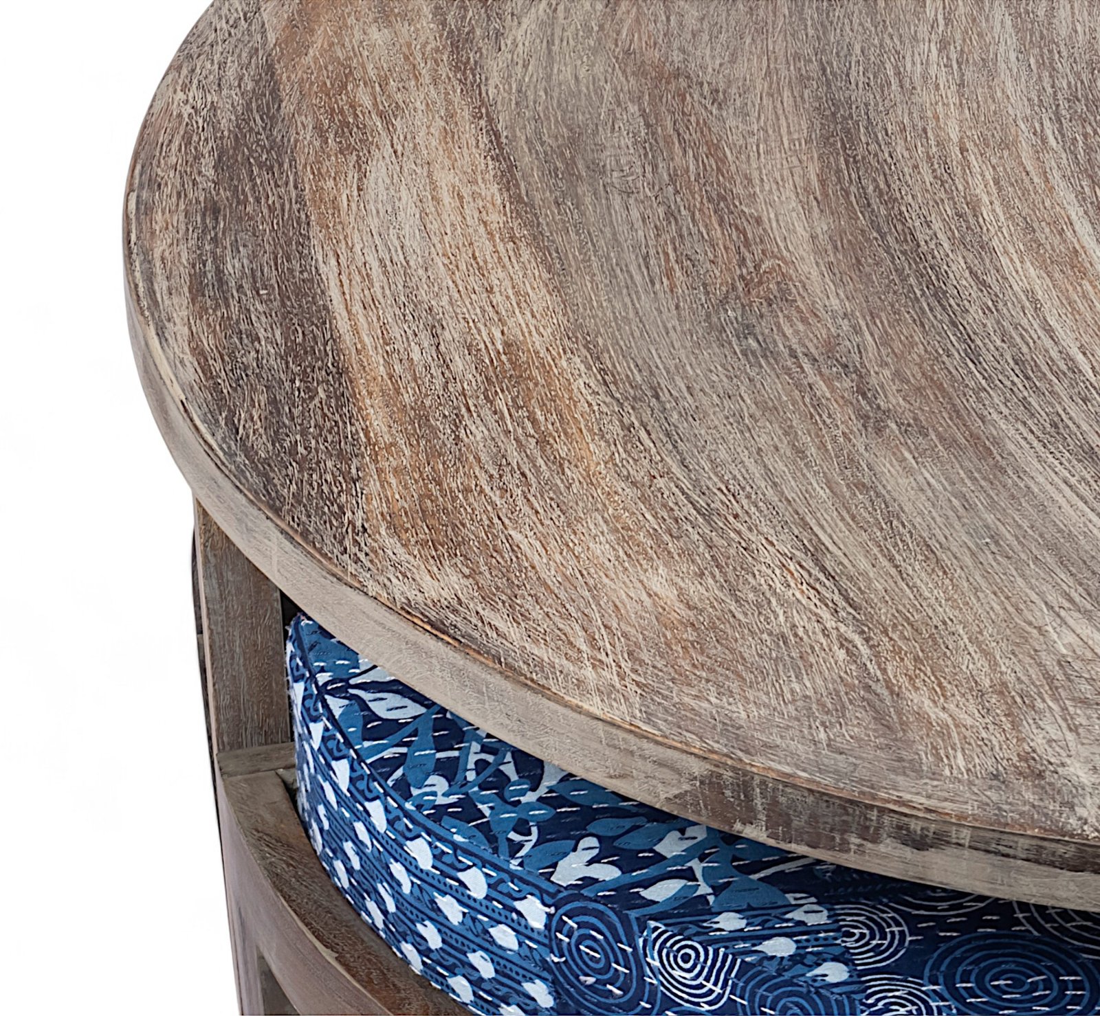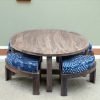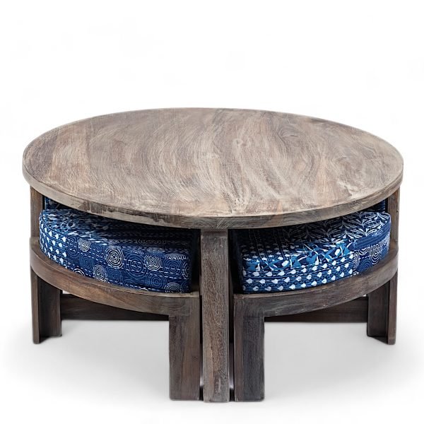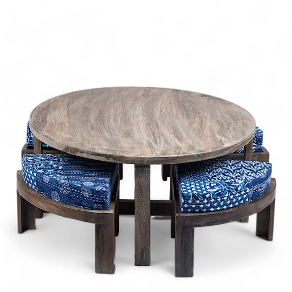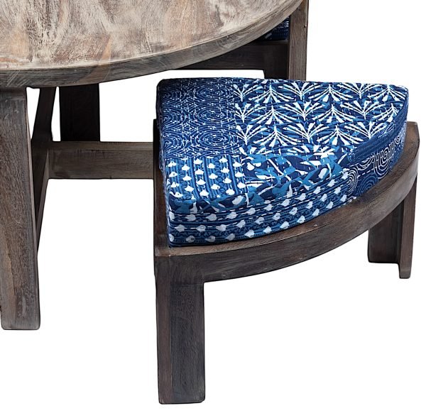 Nashville Sheesham Wood Country Side Coffee Table Set with 4 Stools in ANTIQUE GREY FINISH with Indigo Patchwork Kantha Cushions