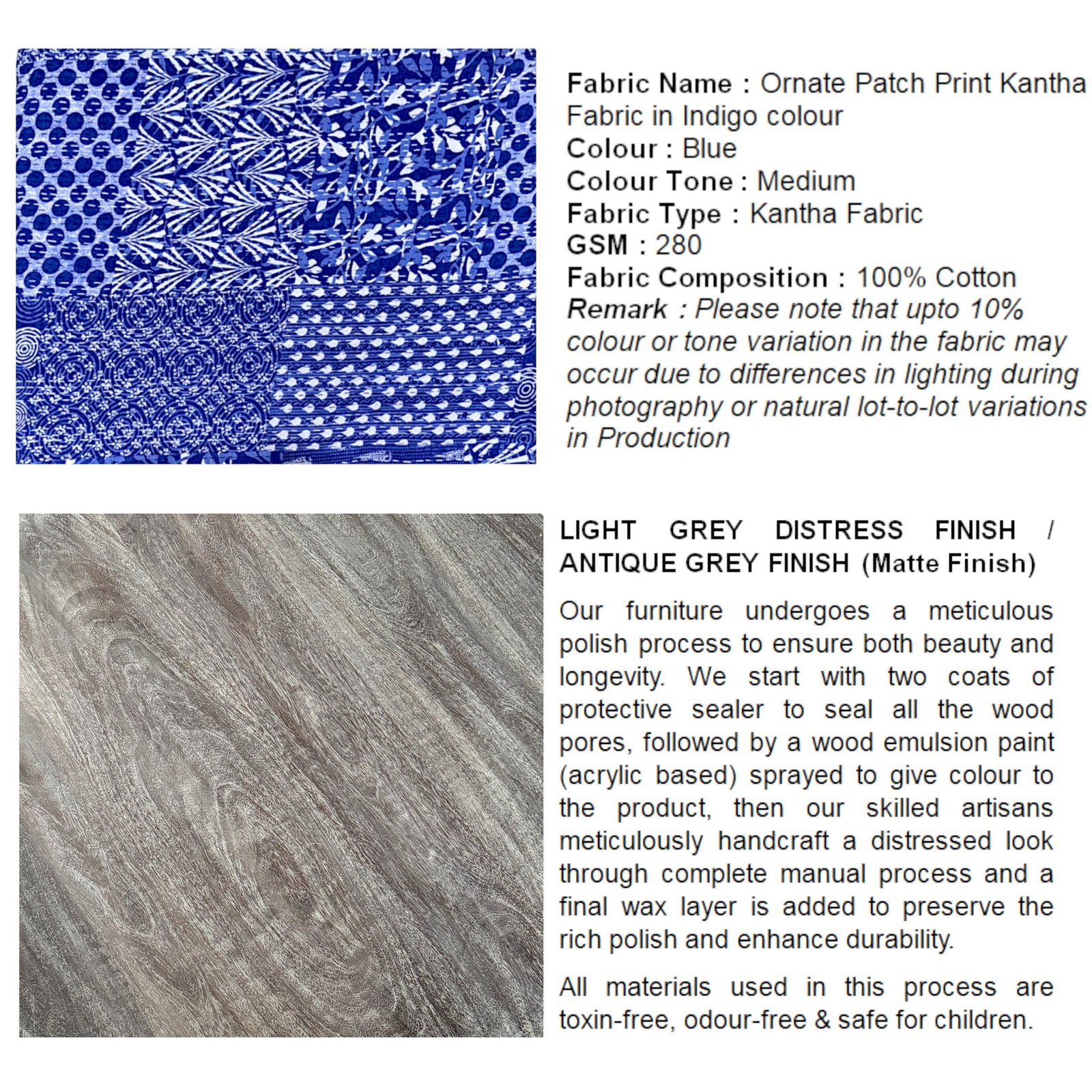 Color | Antique Grey Finish with Indigo Patchwork Kantha Cushions |