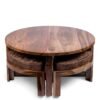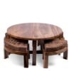 Ikiriya Nashville Sheesham Wood Accent Coffee Table Set with 4 Stools in Teak Finish with Caramel Brown Sparkle Velvet Cushions