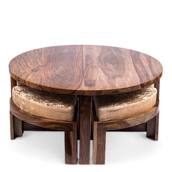 Nashville Sheesham Wood Accent Coffee Table Set with 4 Stools in TEAK FINISH with Beige Sparkle Velvet Cushions