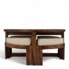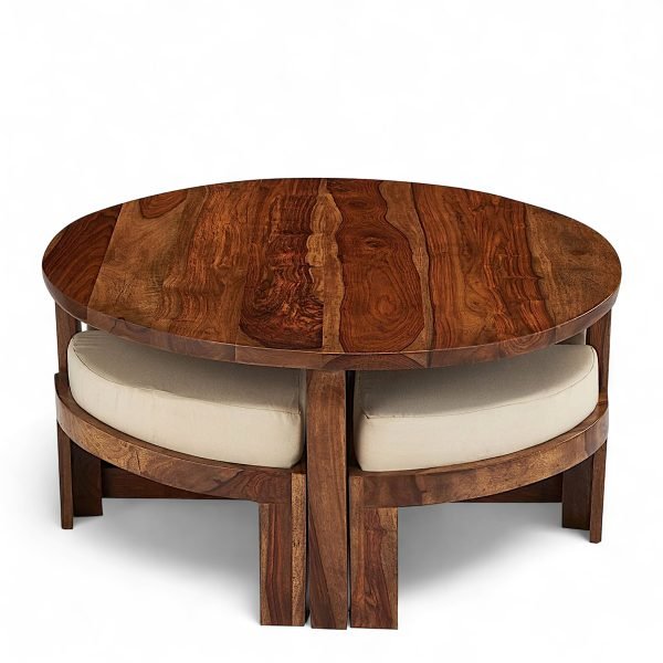 Nashville Sheesham Wood Accent Coffee Table Set with 4 Stools in NATURAL TEAK FINISH with Jute White Cushions