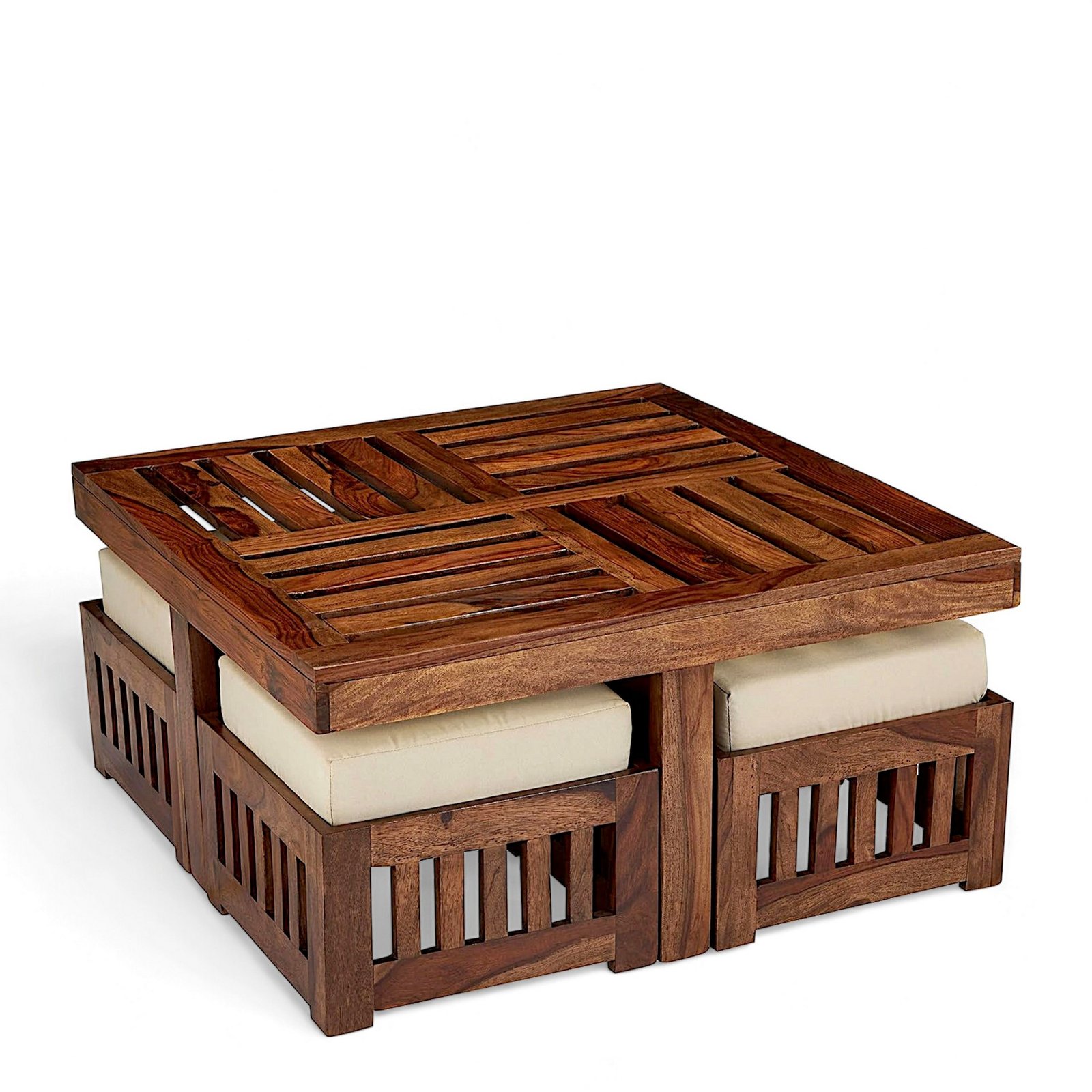 Ikiriya Palladio Sheesham Wood Accent Coffee Table Set with 4 Stools in Natural Teak Finish with Jute White Cushions