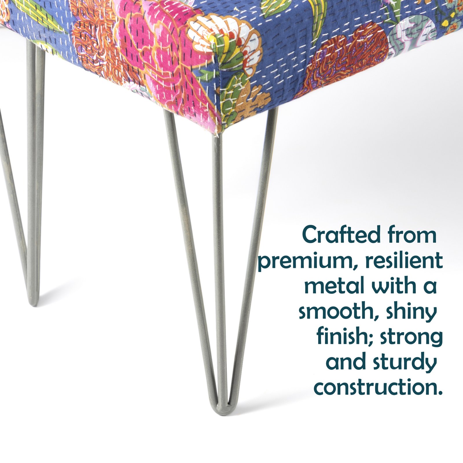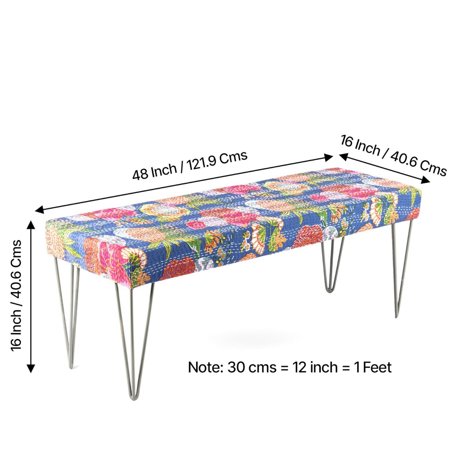 Ikiriya Belmont Sheesham Wood Mid Century 3 Seater Bench with Metal Legs in Fruit Print Blue Kantha