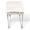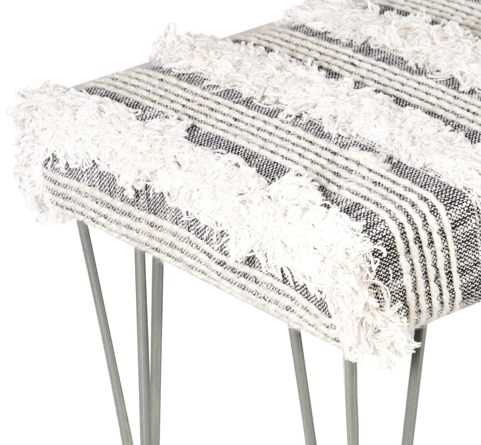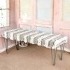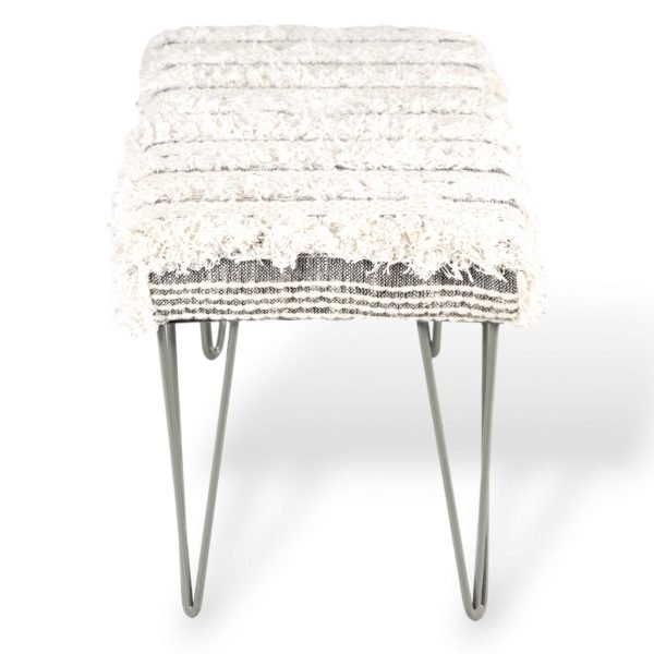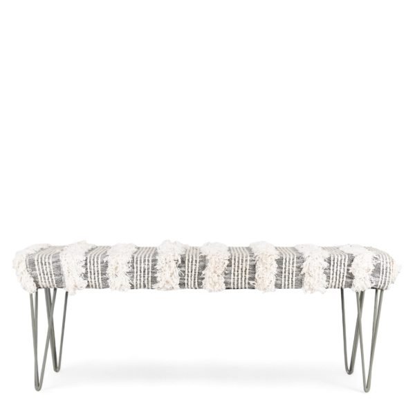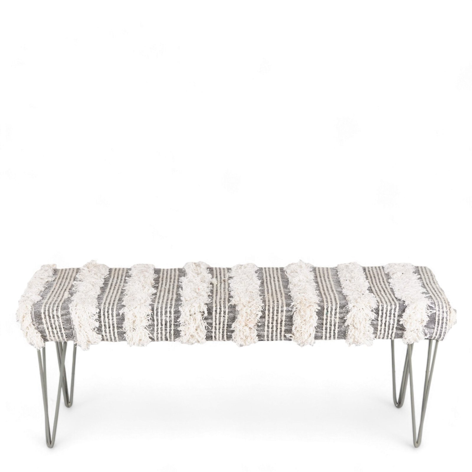Belmont Sheesham Wood Mid Century 3 Seater Bench with Metal Legs in Grey Fabric with Fringes