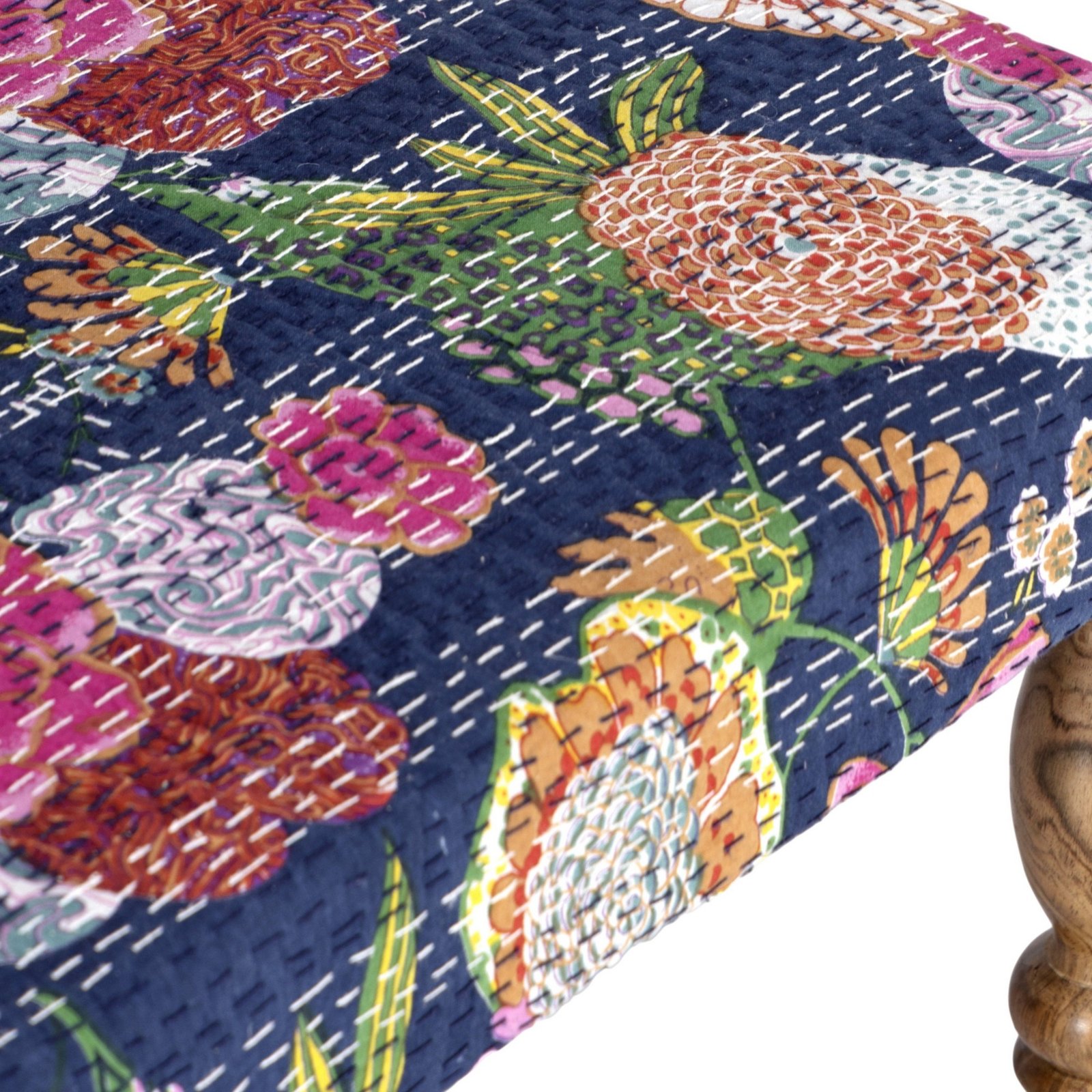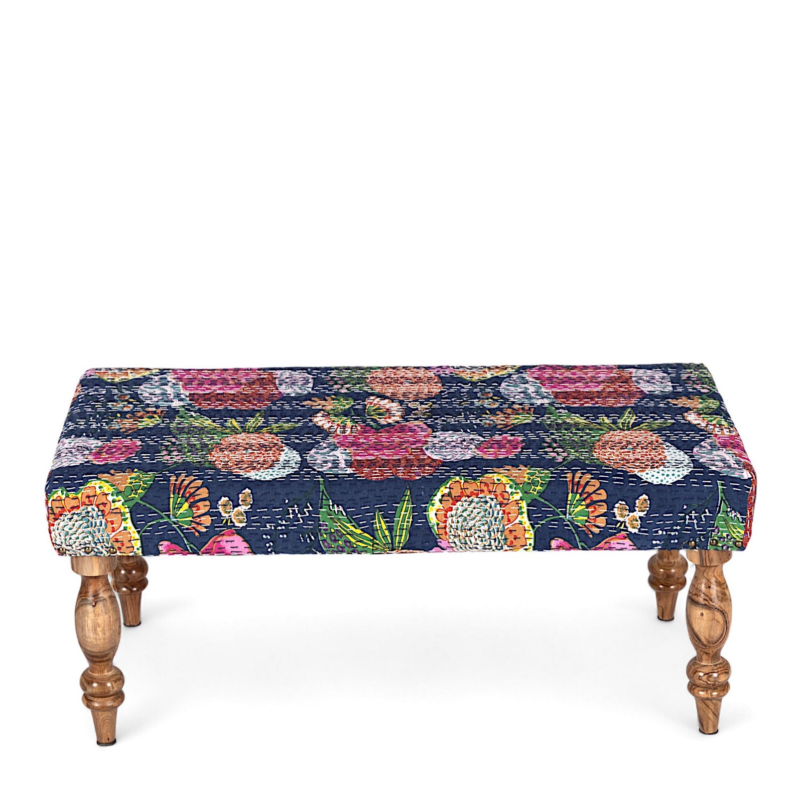 Ikiriya Bestone Sheesham Wood Mid Century 2 Seater Bench in Fruit Print Blue Kantha