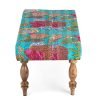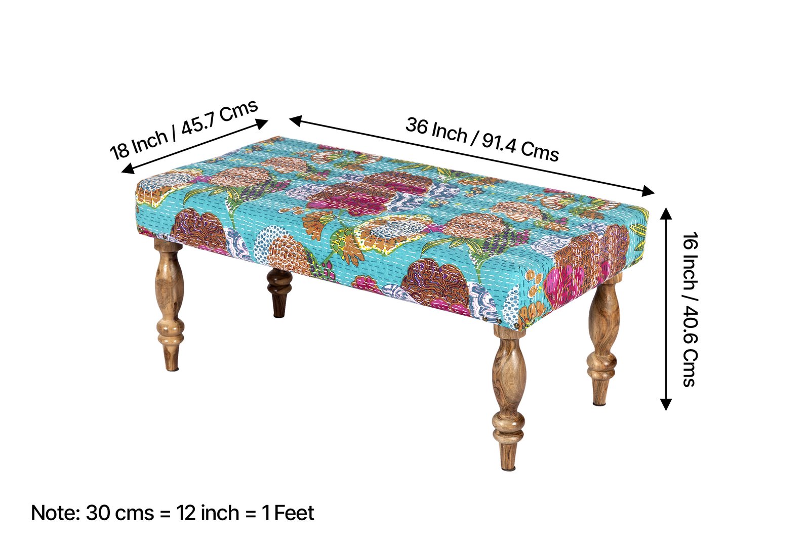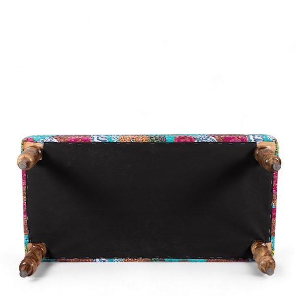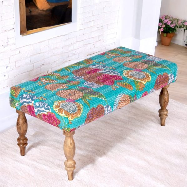 Bestone Sheesham Wood Mid Century 2 Seater Bench in Sea Green Fruit Print Kantha