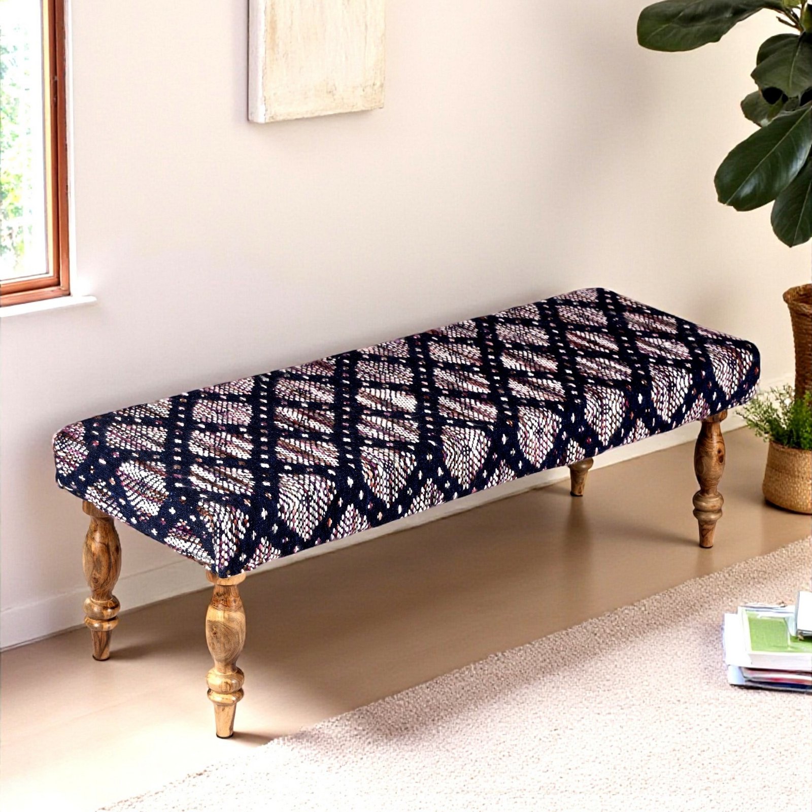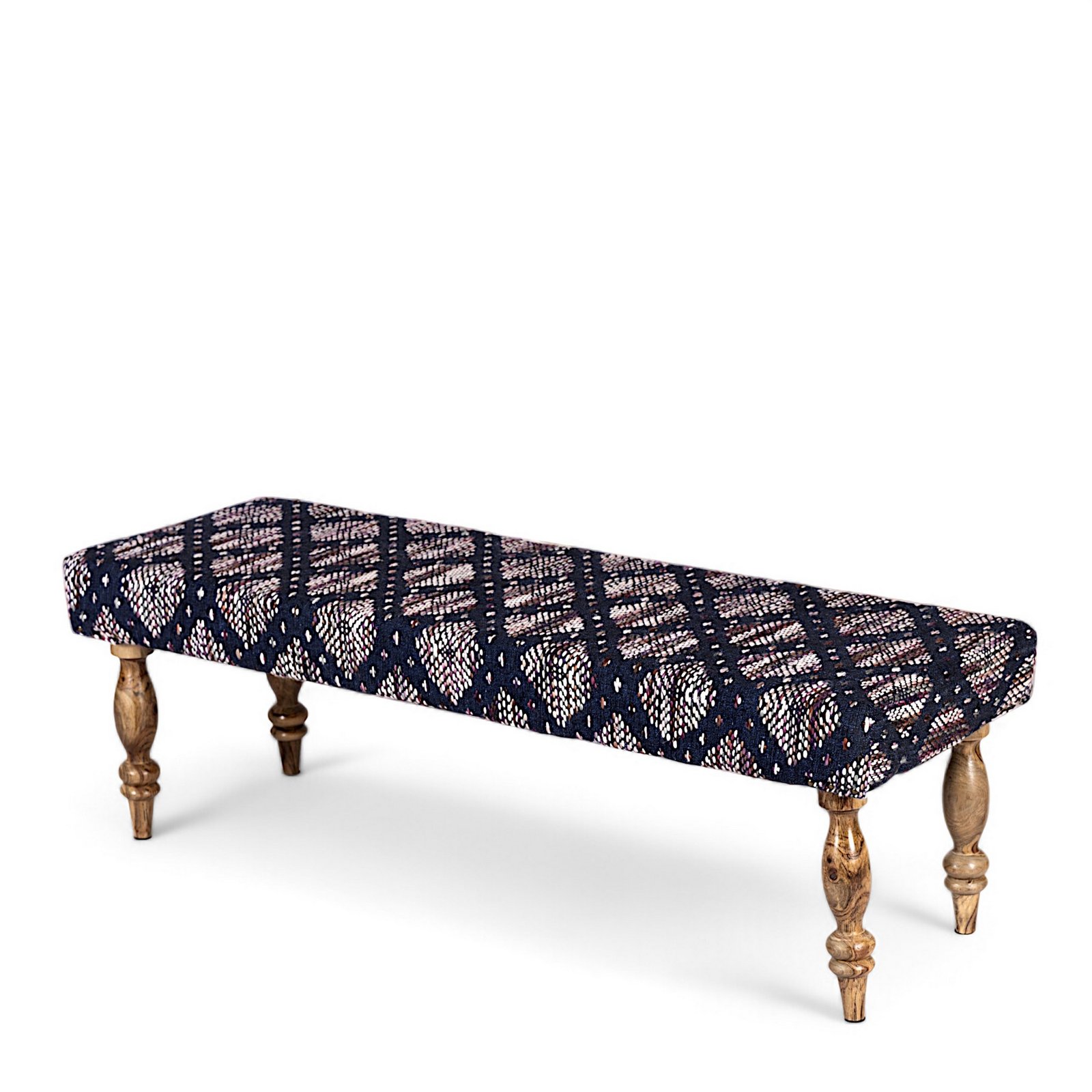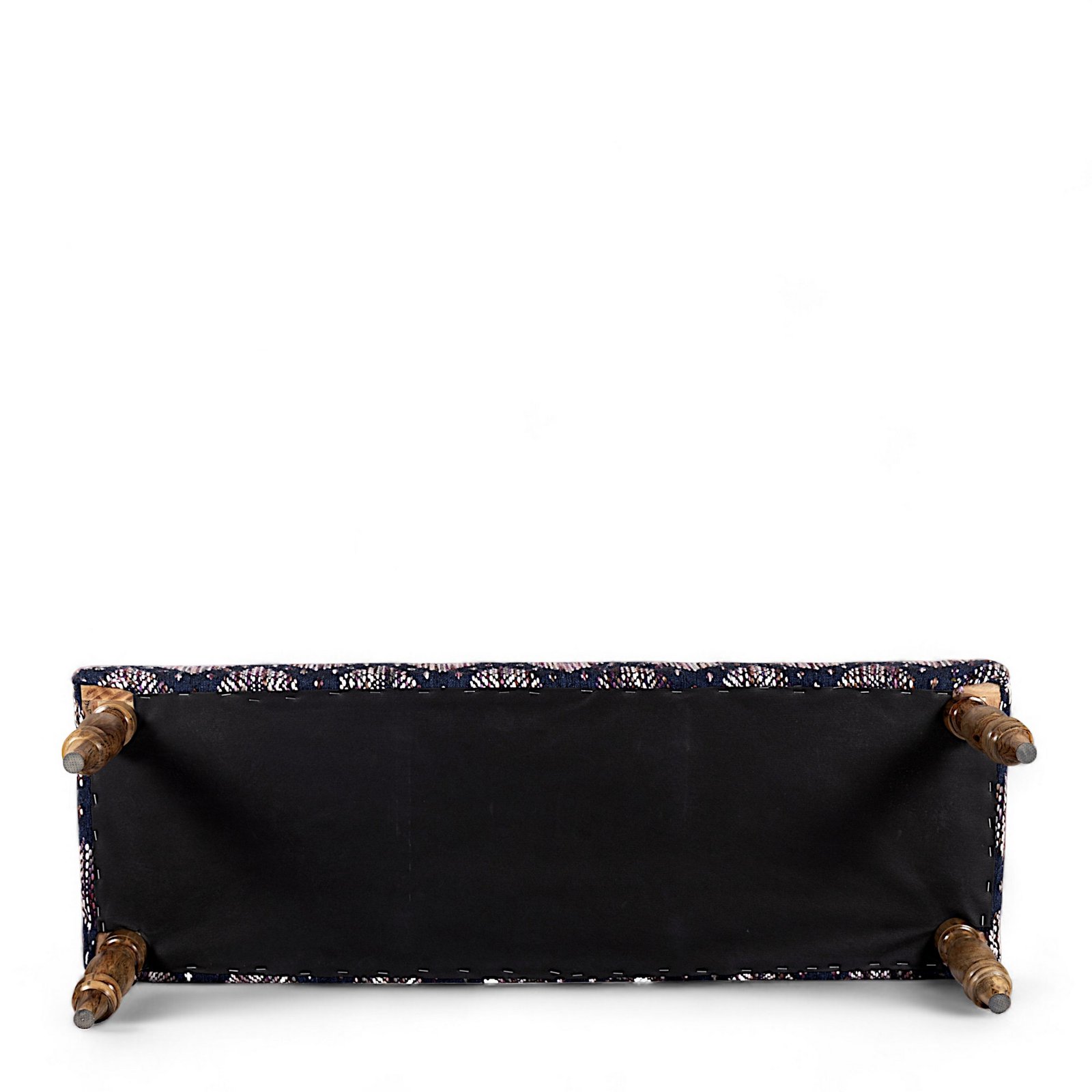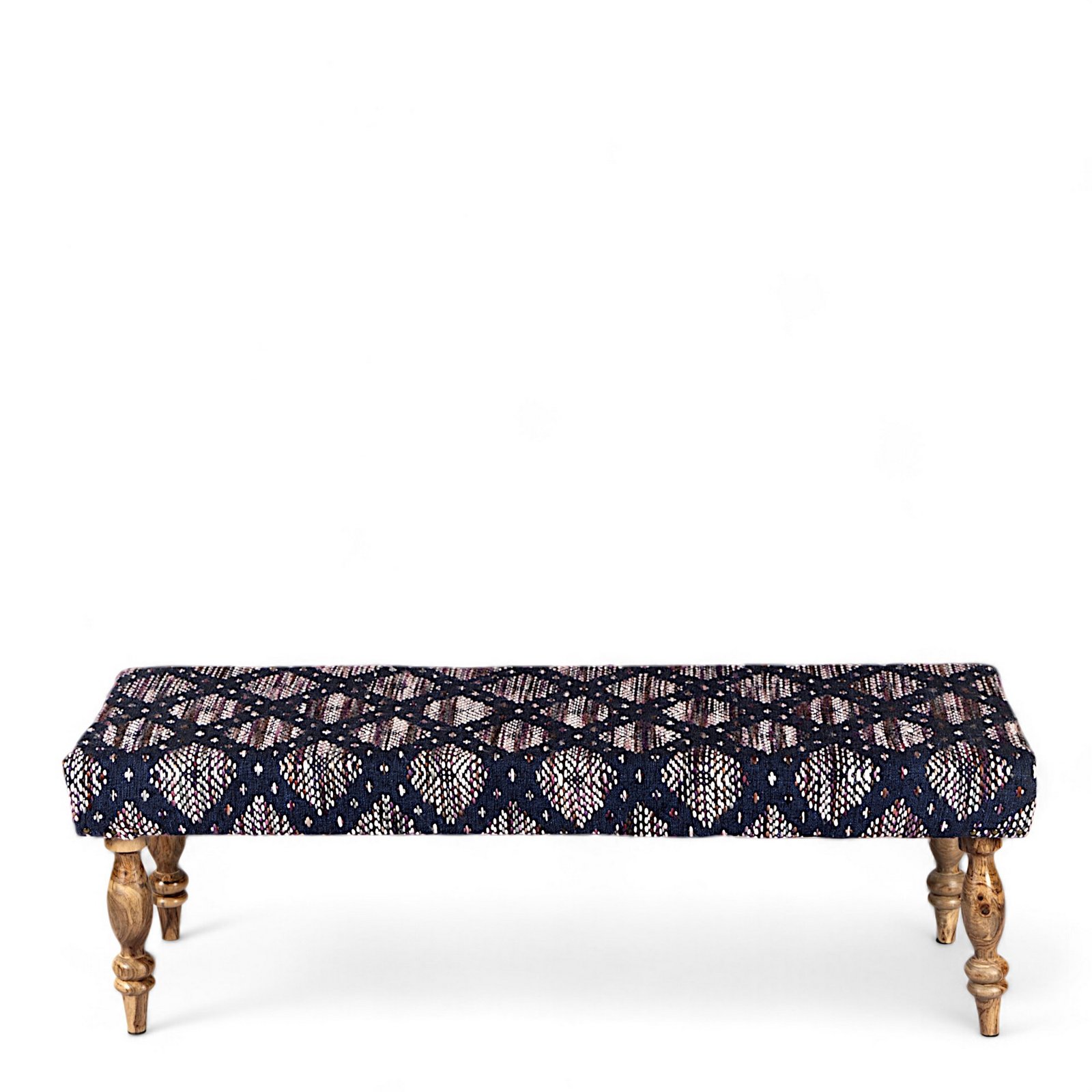 • Ikiriya Cairo Sheesham Wood Mid Century 3 Seater Bench in indigo Patchwork Kantha