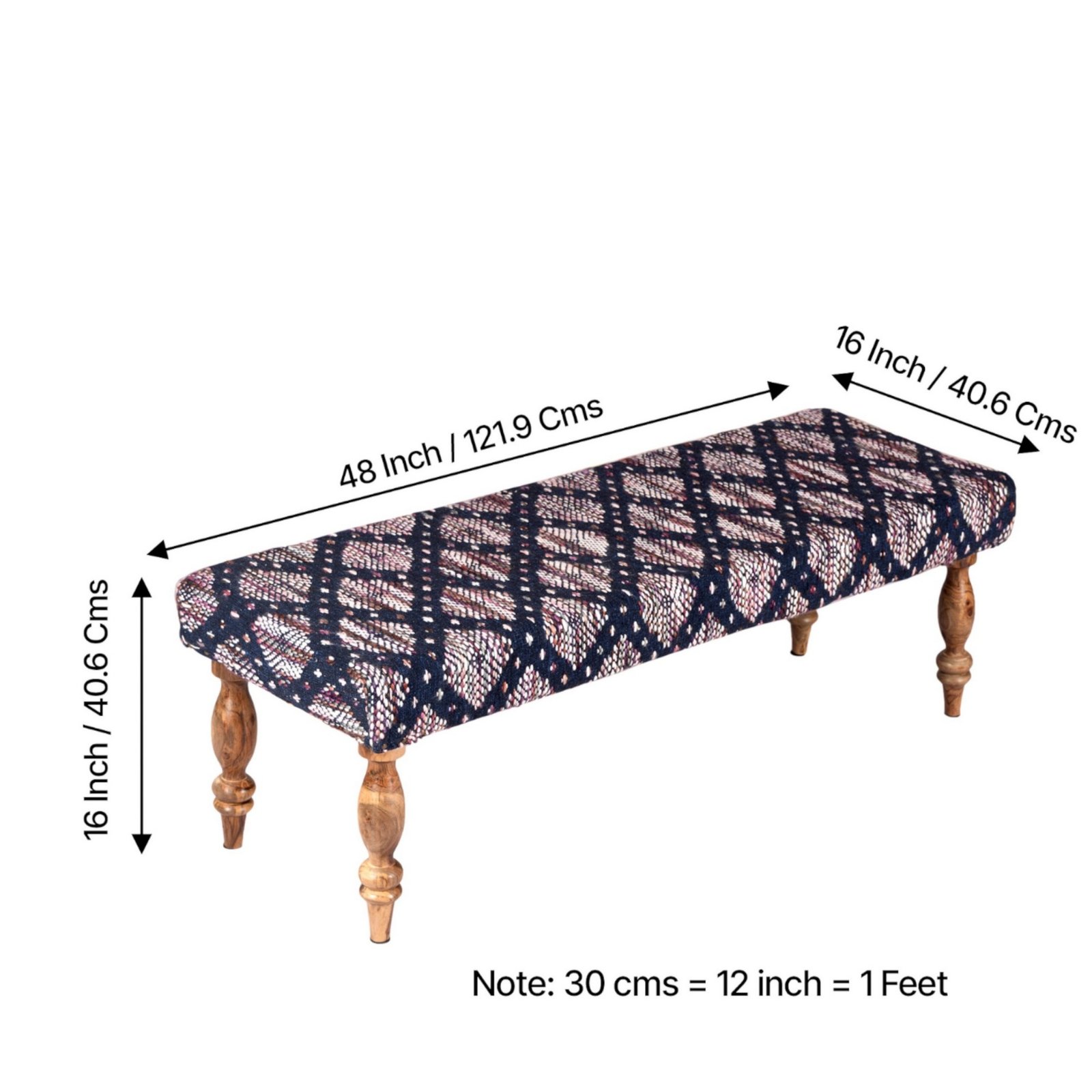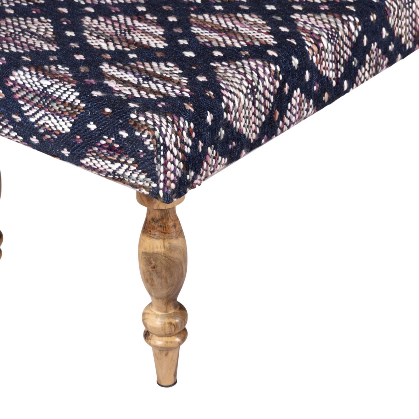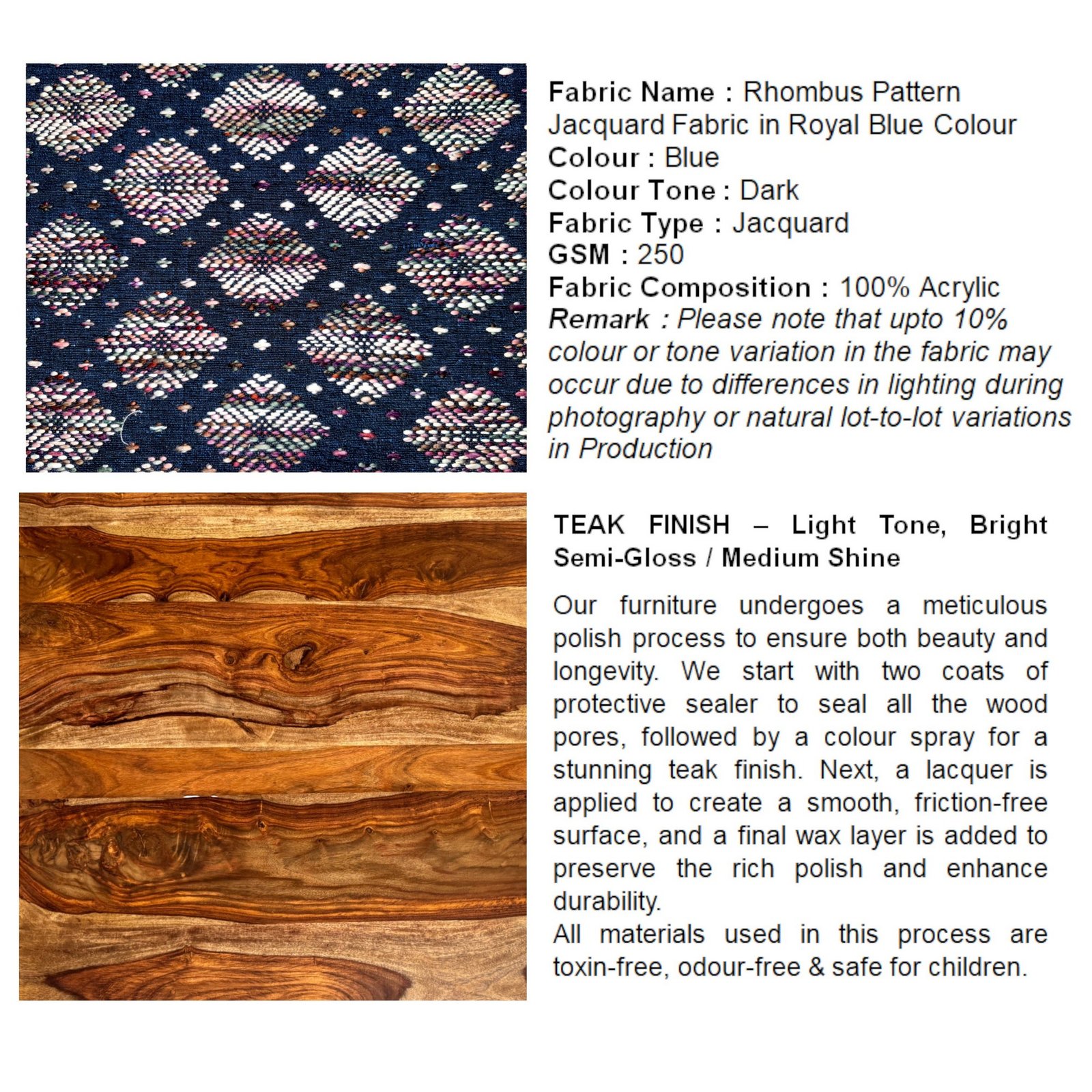 • Ikiriya Asteria Sheesham Wood Accent 3 Seater Bench in Blue Jacquard Work Fabric