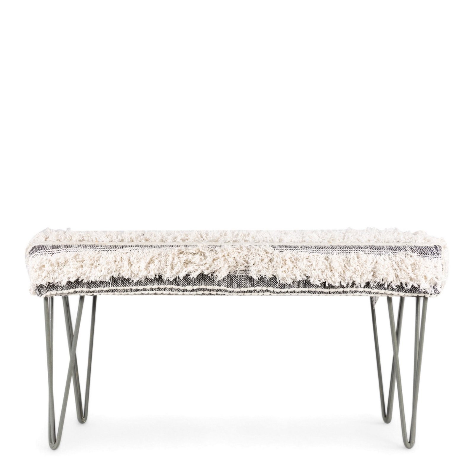 Ikiriya Velas Sheesham Wood Mid Century 2 Seater Bench with Metal Legs in Grey Fabric with Fringes