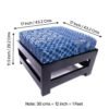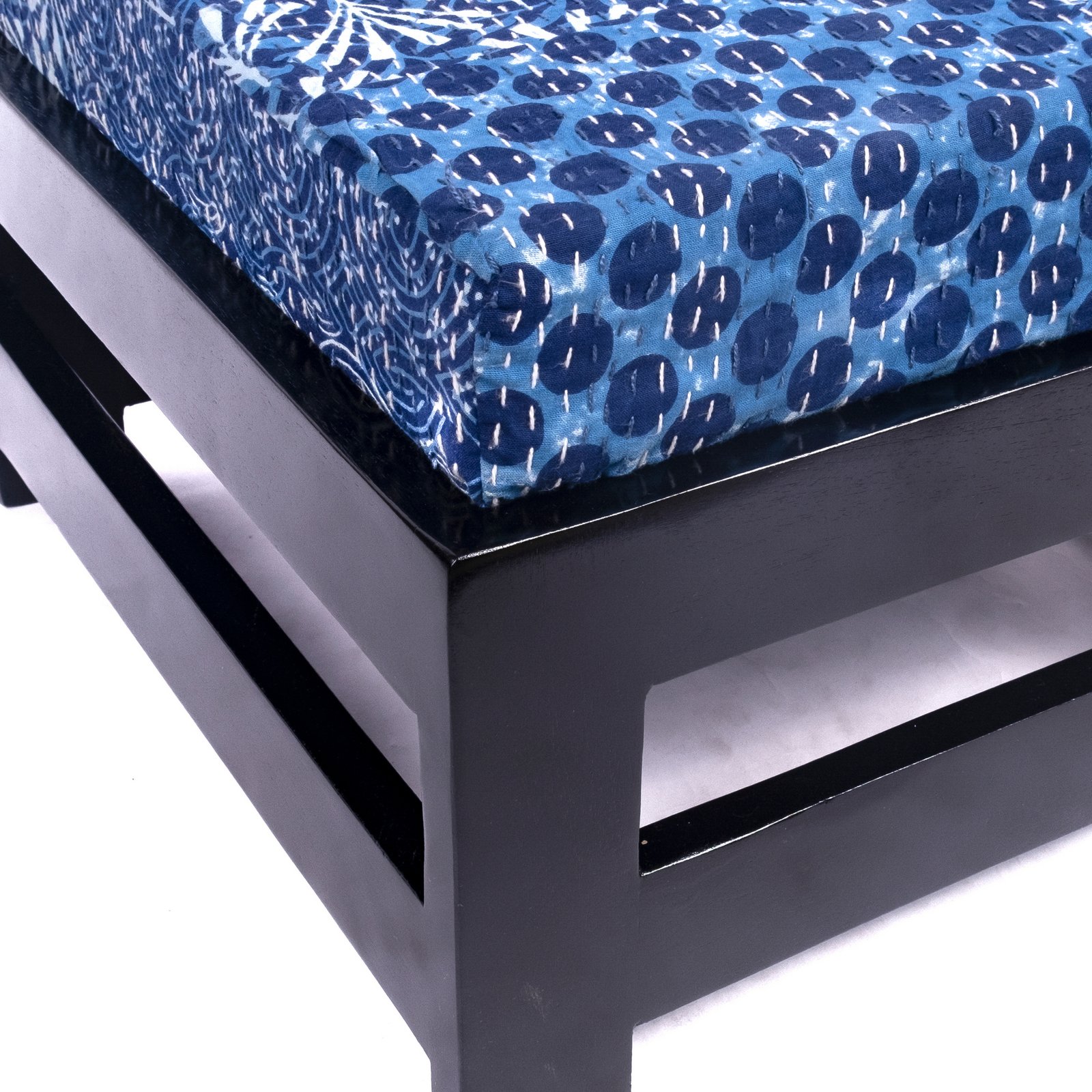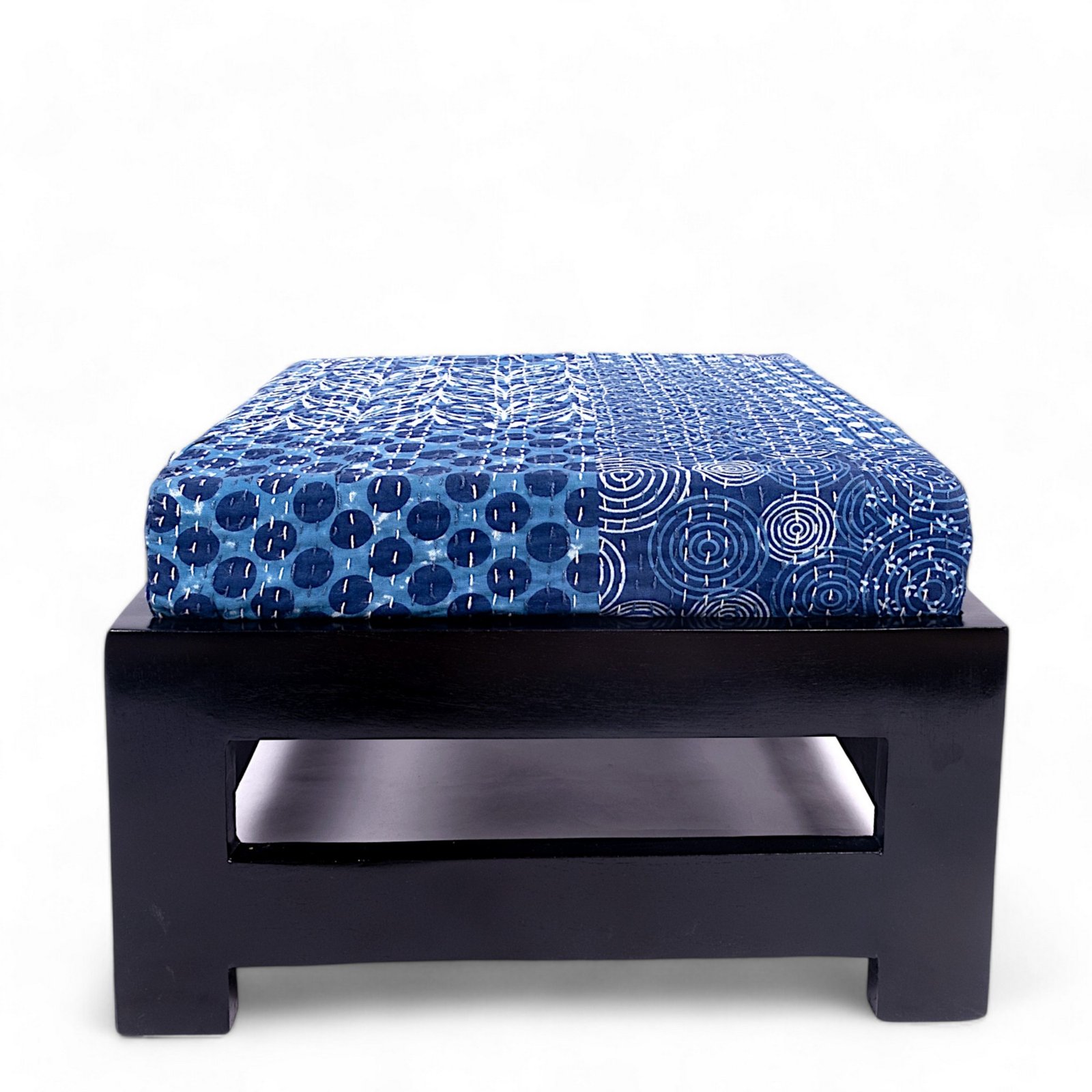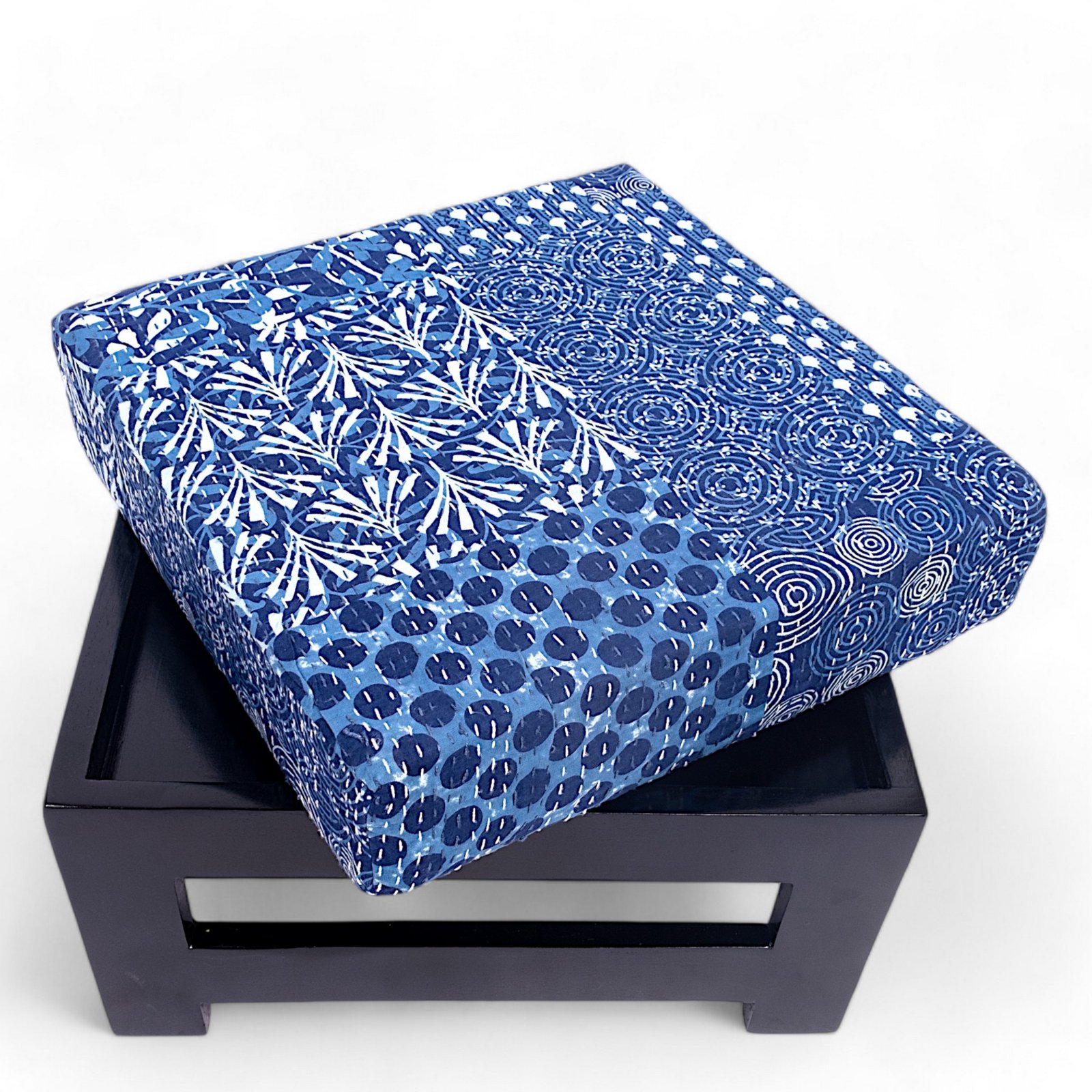 Ikiriya Amber Sheesham Wood Mid Century Square Foot Stool in Extra Dark Mahagony Finish with indigo Patchwork Kantha Cushion