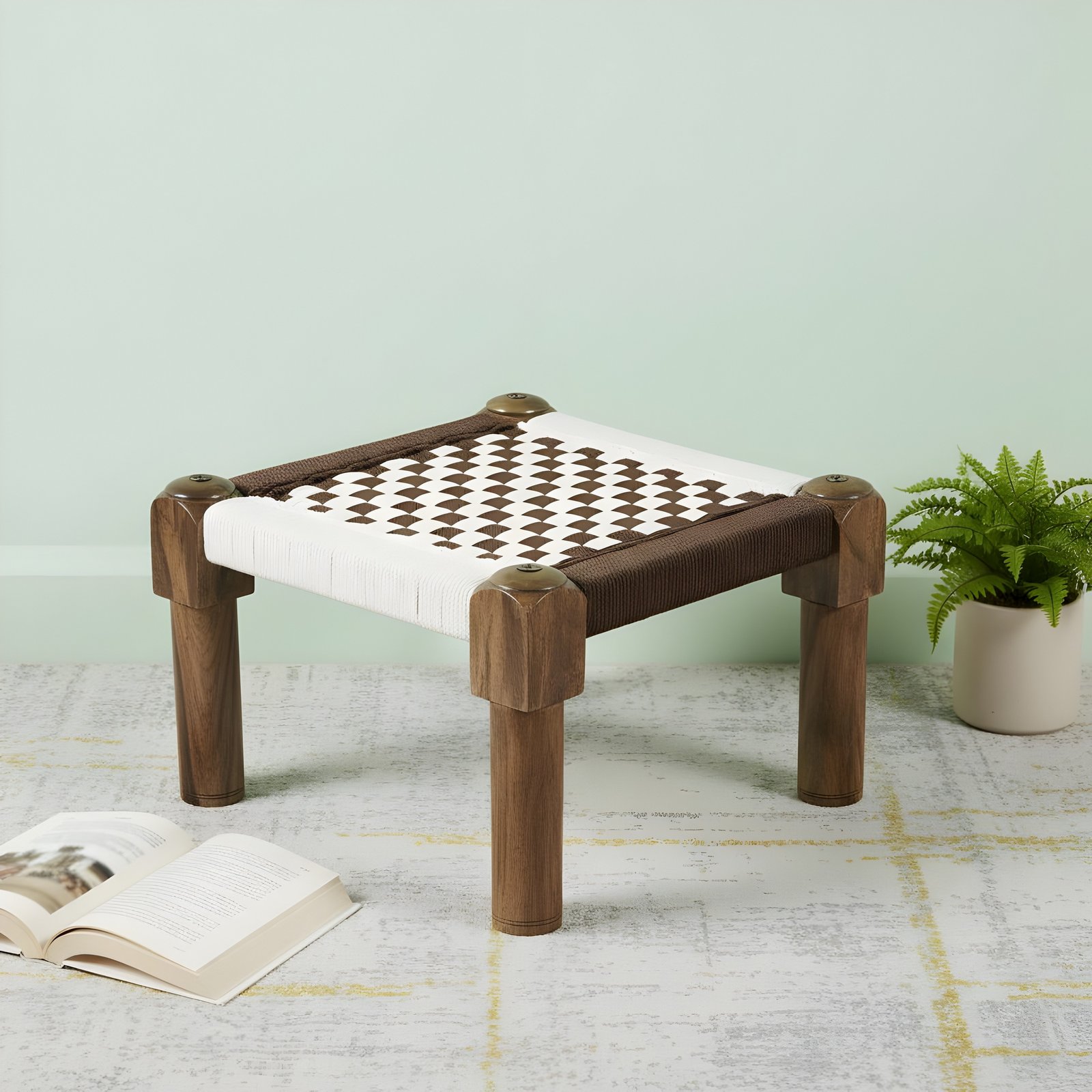 Ikiriya Riaza Sheesham Wood Vintage Square Maachi Set of 2 Foot Stools in Brown & White Rope Canning