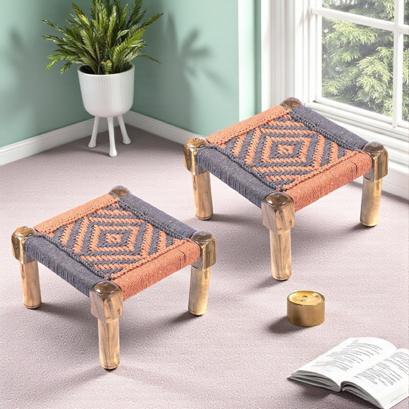 Ikiriya Riaza Sheesham Wood Vintage Square Maachi Set of 2 Foot Stools in Orange & Grey Rope Canning