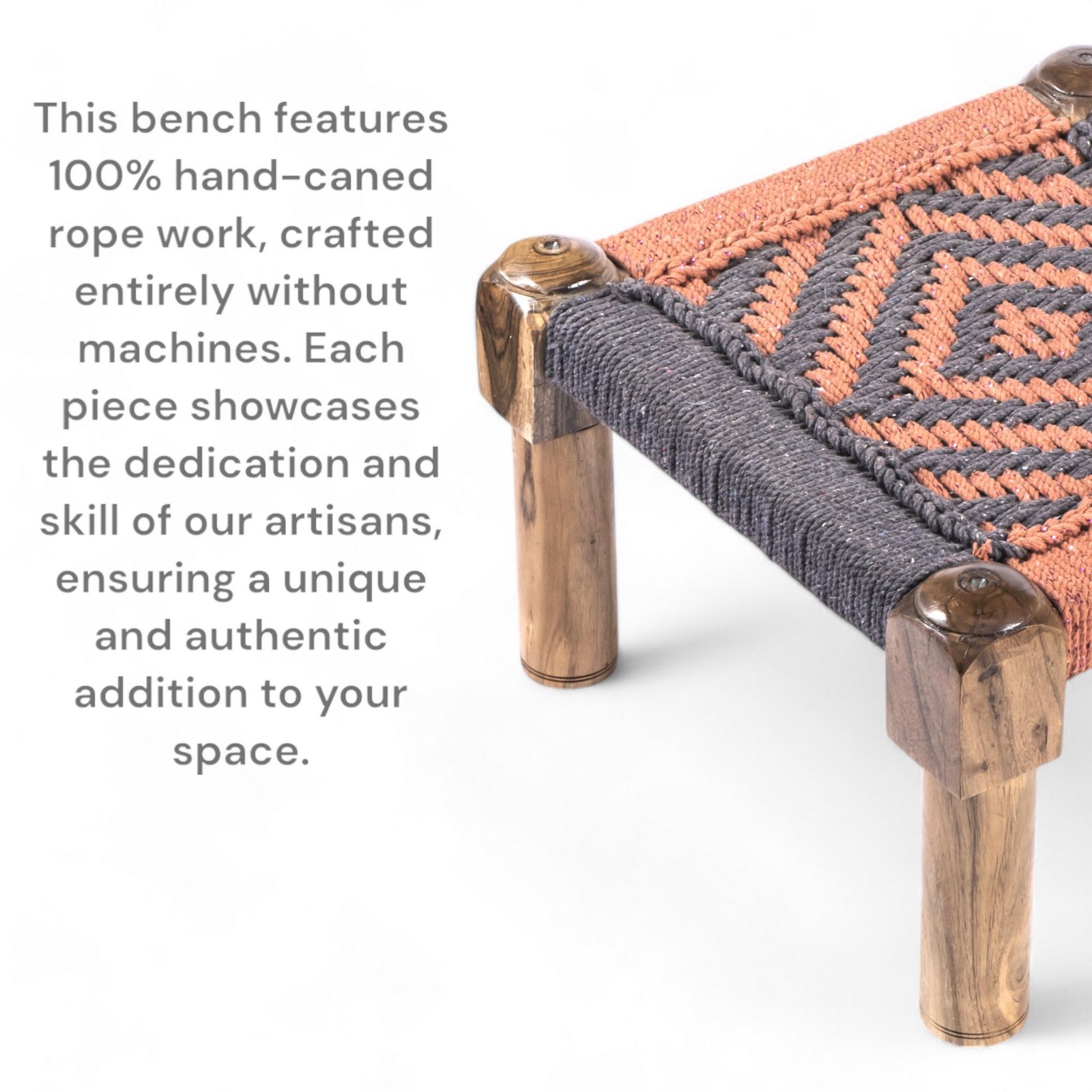 - Experience the charm of Maachi Work with this handcrafted bench from Jaipur. Woven by skilled artisans using vibrant, durable strong cotton ropes, it showcases intricate patterns made entirely by hand, preserving the traditional craft without any machine involvement.