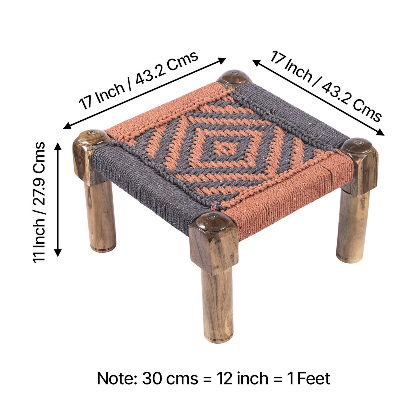 Celebrate tradition with the Ikiriya footstool, featuring vibrant handknitted ropes and a durable Sheesham wood frame. This vintage stool incorporates traditional Maachi work from Jaipur, showcasing intricate craftsmanship with no machine intervention. Whether in your home or a commercial setting, this unique footstool adds a colorful and cultural touch to any space.