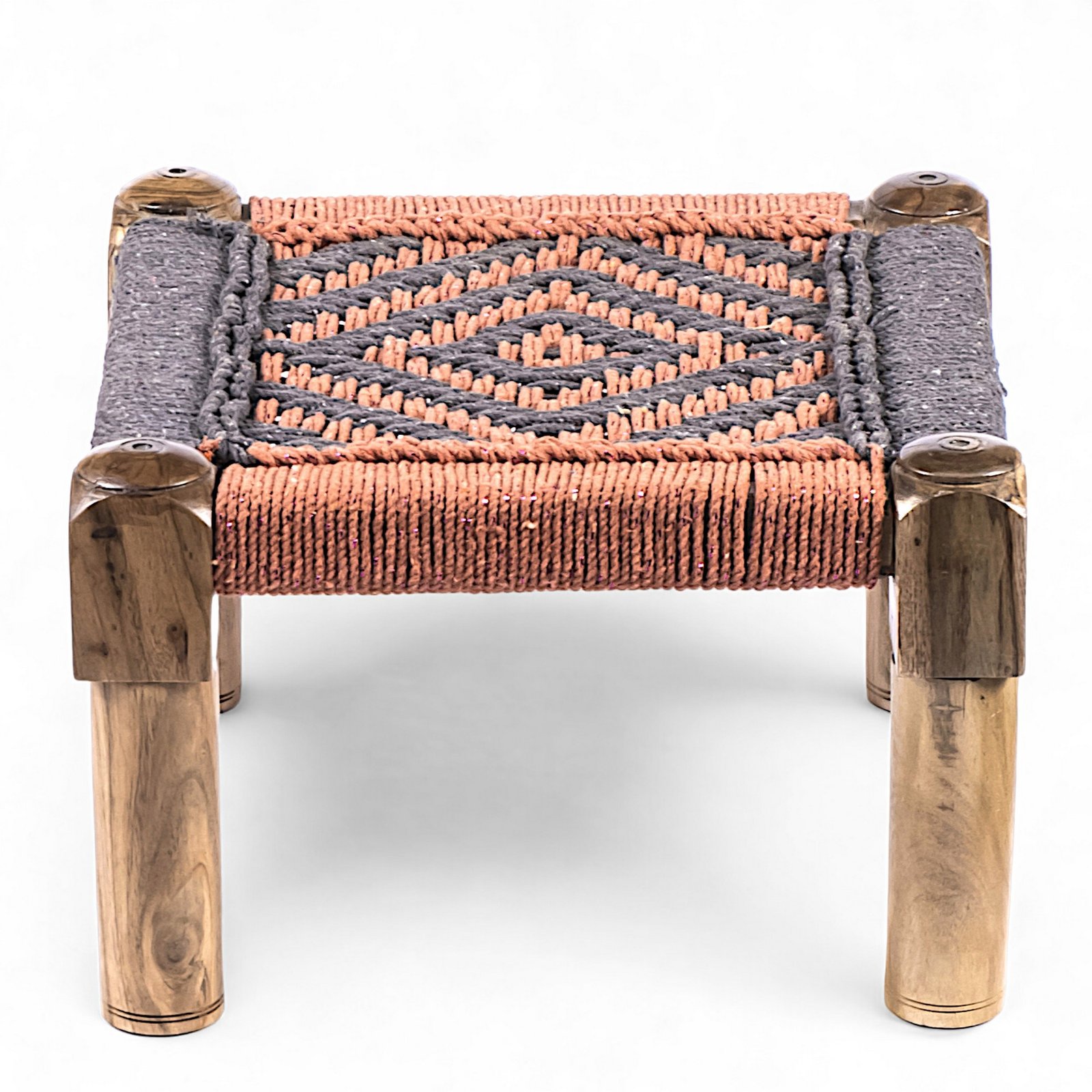 Ikiriya Riaza Sheesham Wood Vintage Square Maachi Foot Stool in Orange & Grey Rope Canning