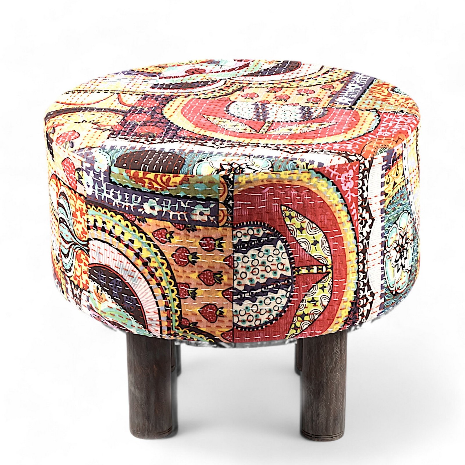 Ikiriya Collio Acacia Wood Bohemian Round Set of 2 Ottomans in Israel Print Patchwork Kantha Upholstery