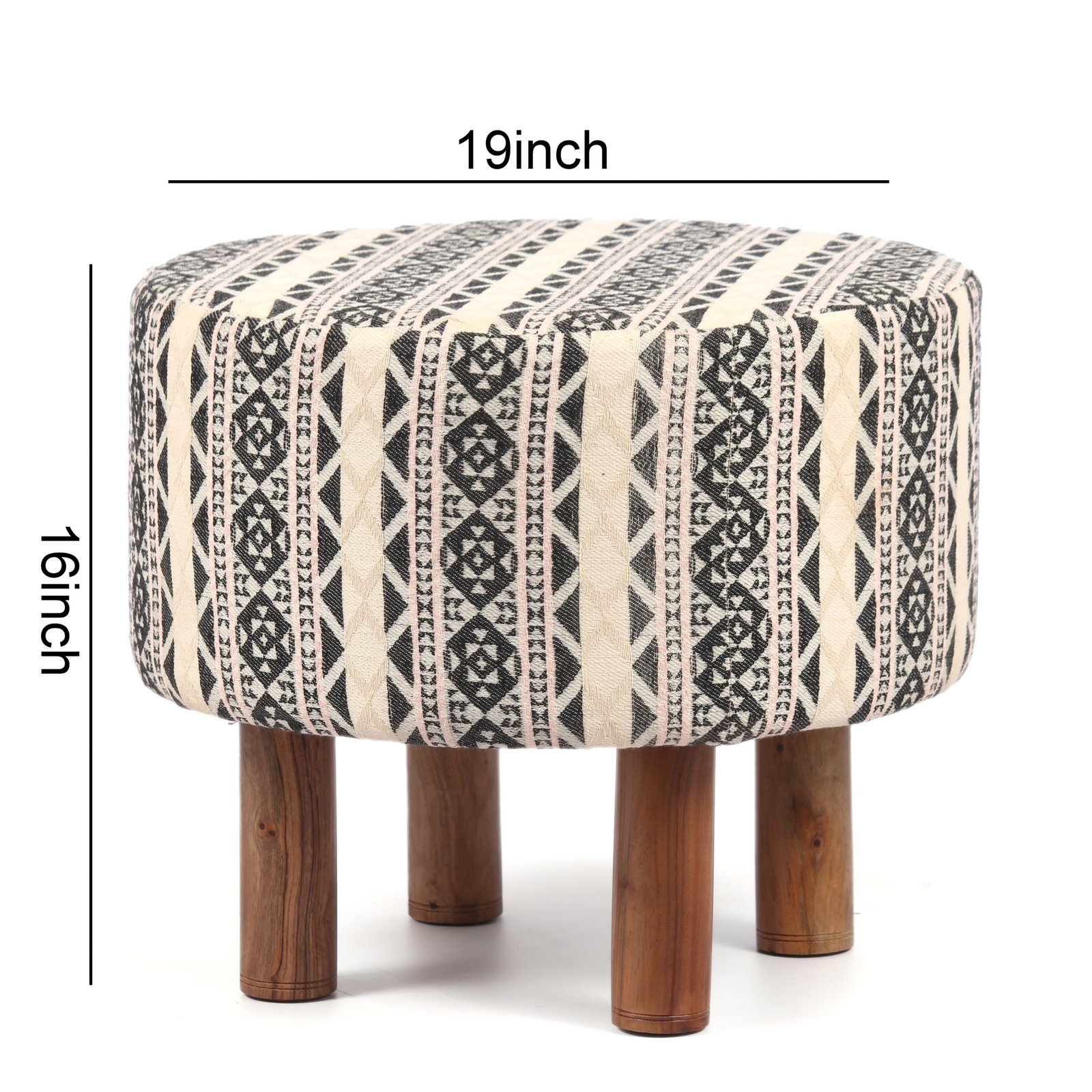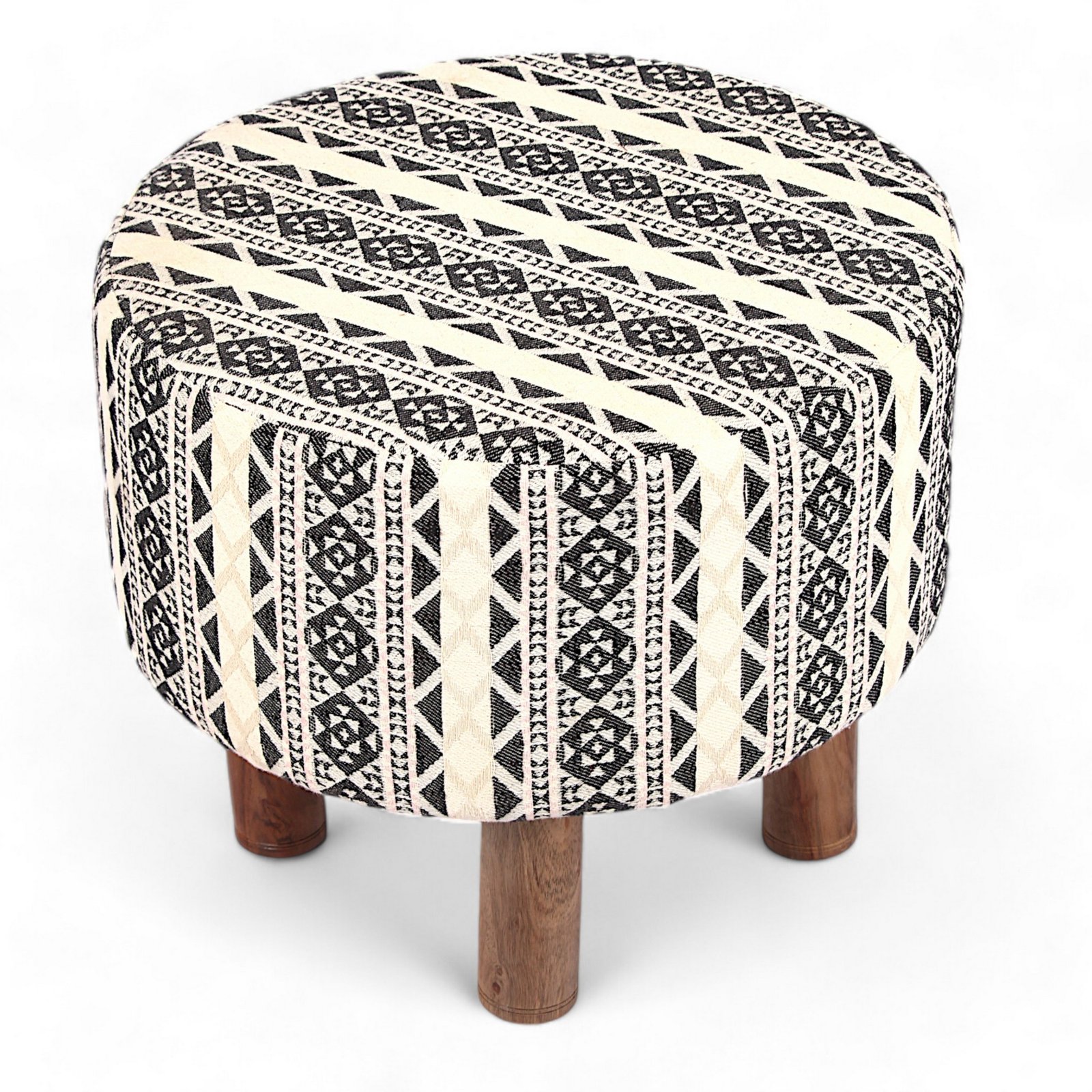 Ikiriya Collio Acacia Wood Parisian Round Ottoman in Multi-Colour Jacquard Work Fabric Upholstery