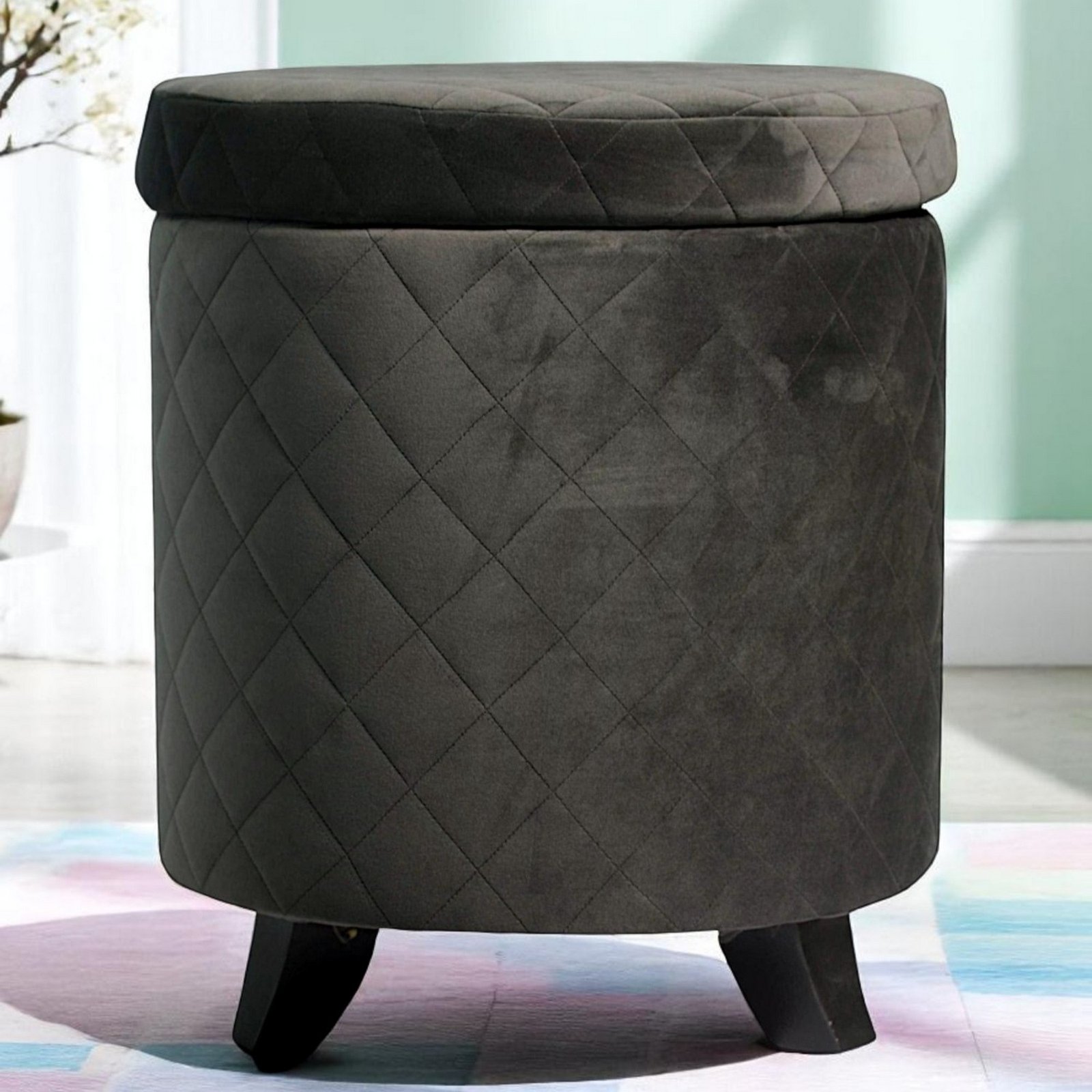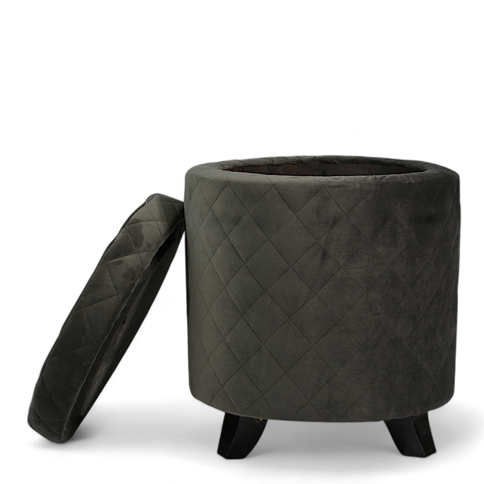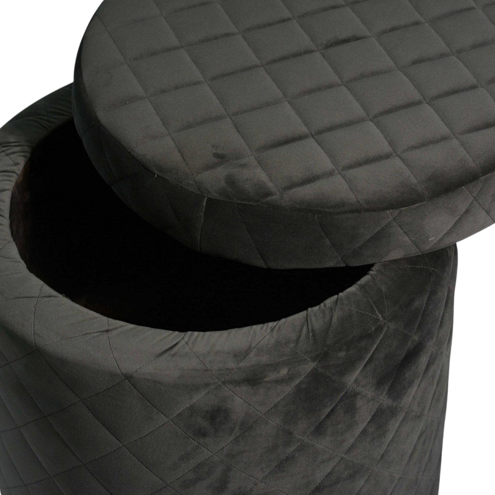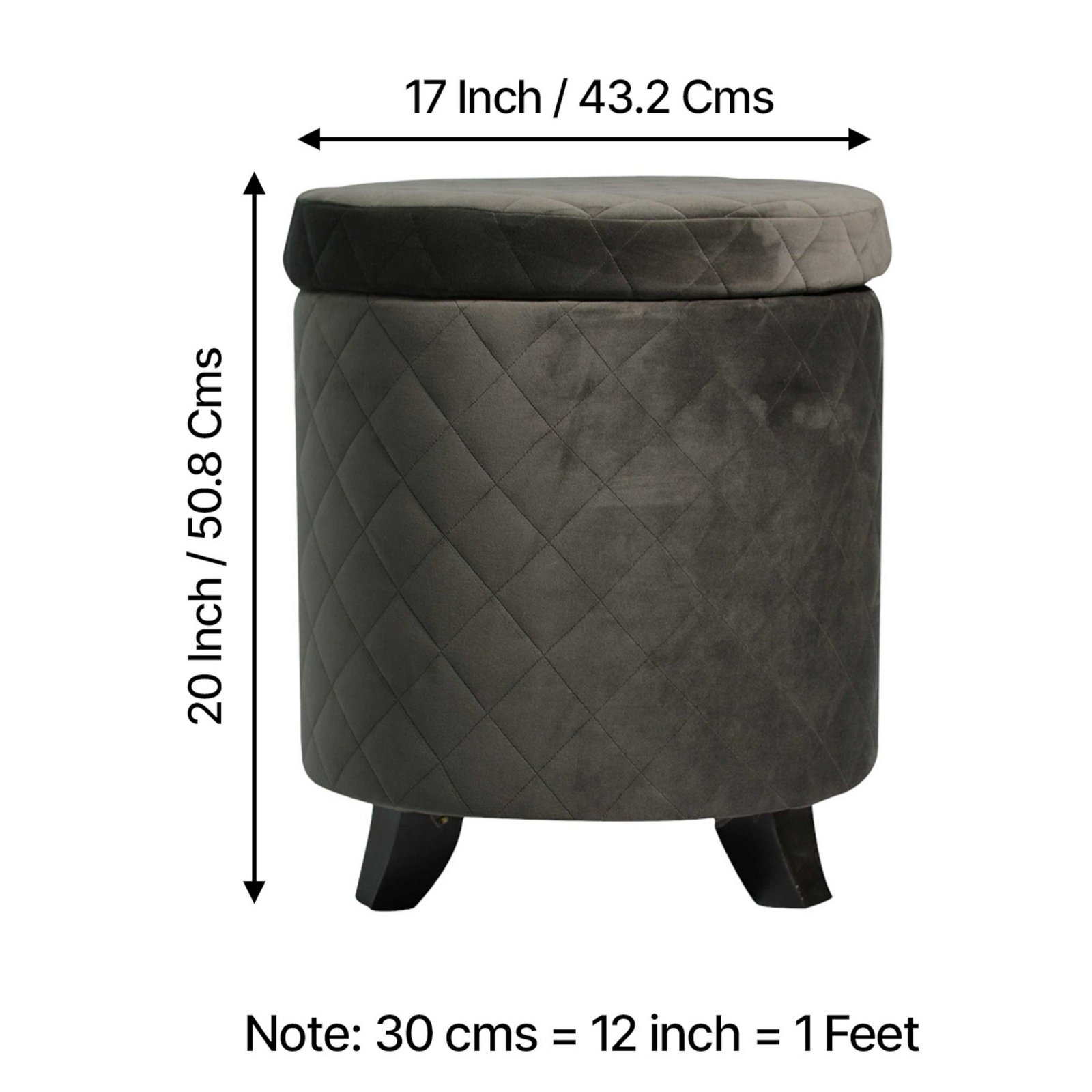 Ikiriya Orlando Solid Wood Accent Round Ottoman in Iron Grey Velvet Upholstery with Storage