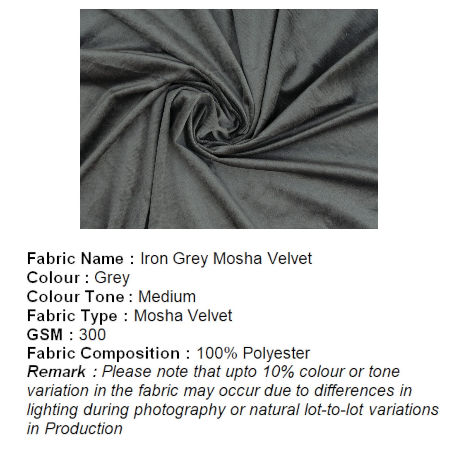 . Fabric Name: Iron Grey Mosha Velvet