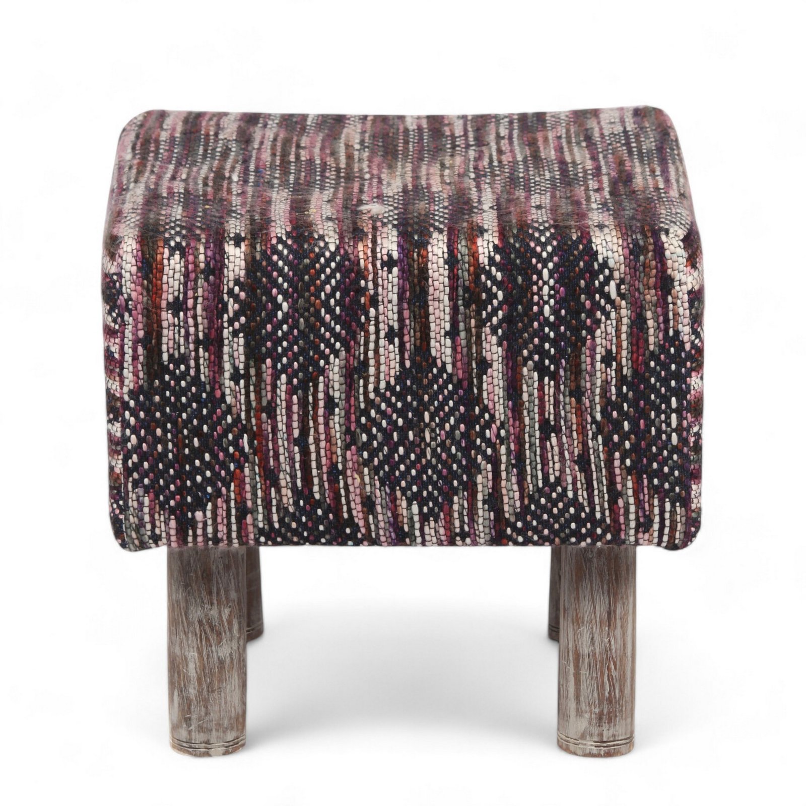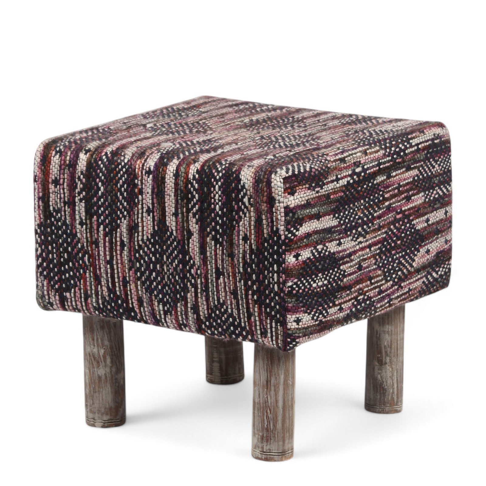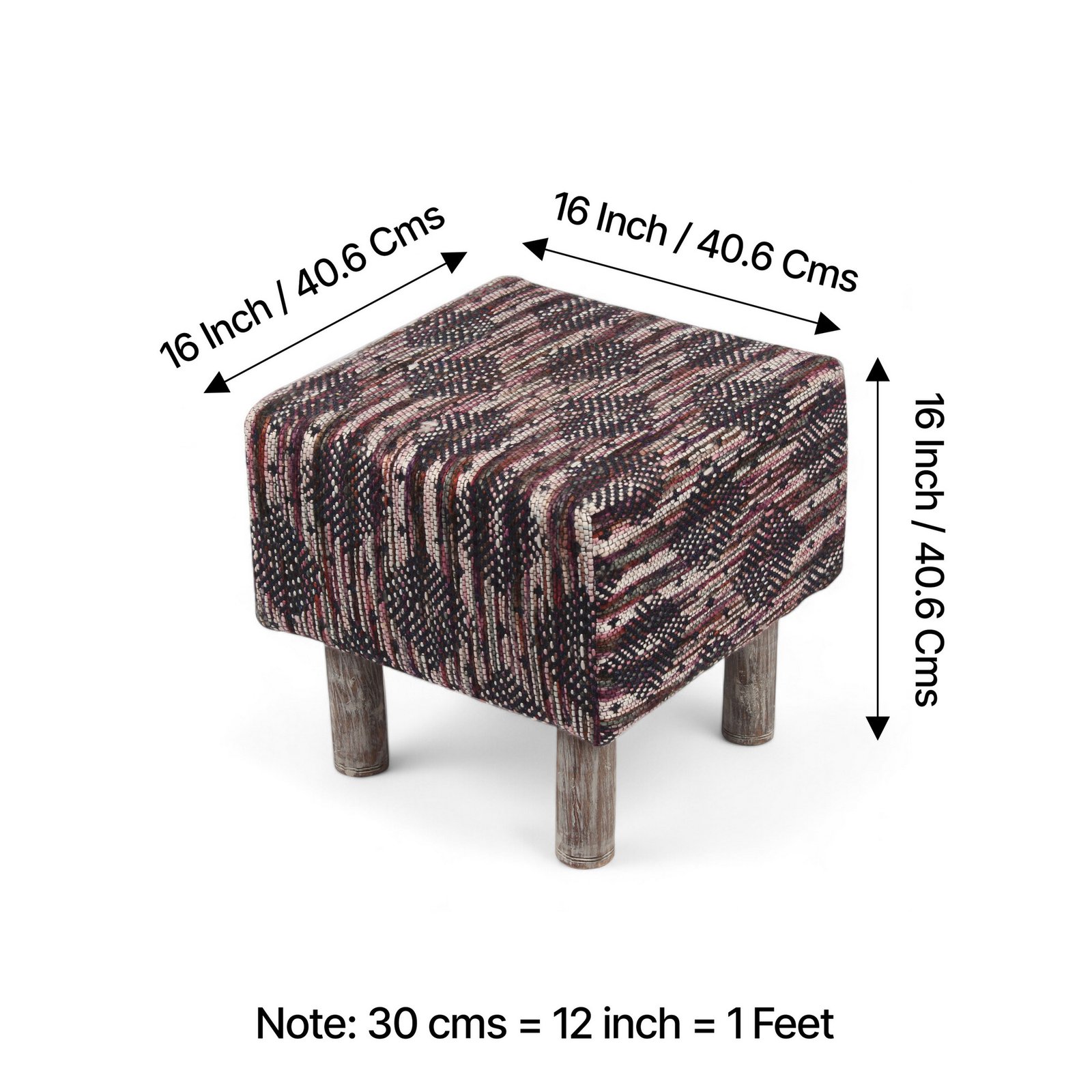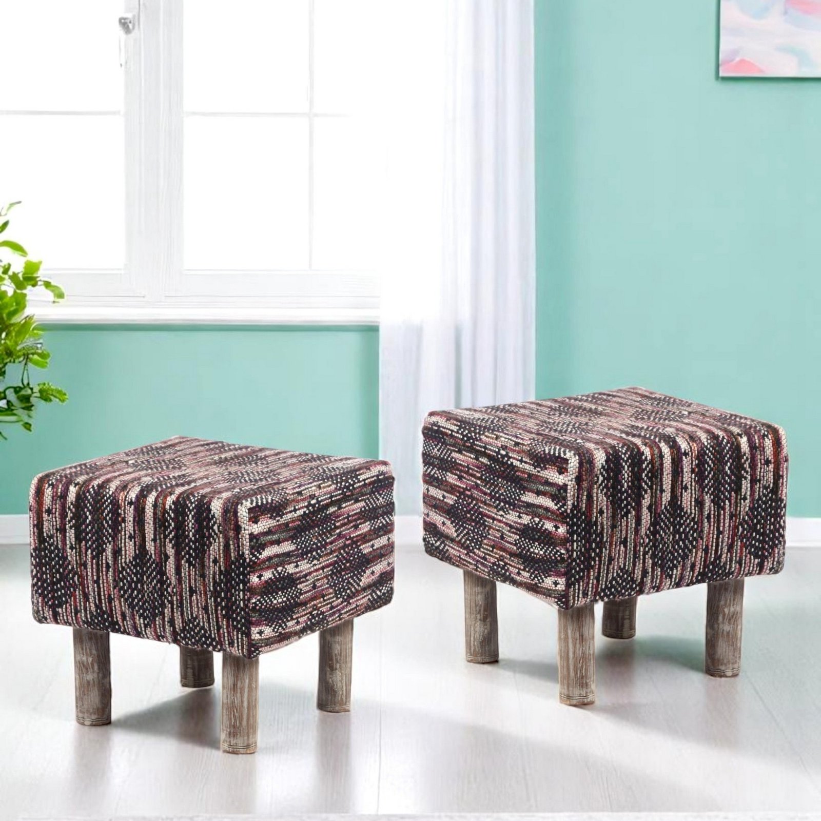 Ikiriya Verona Acacia Wood Parisian Square Set of 2 Pouf Stools in Multi-Colour Jacquard Work Fabric Upholstery