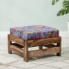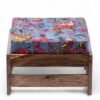 Ikiriya Amber Sheesham Wood Mid Century Round Foot Stool in Teak Finish with Grey Brid Print Kantha Cushion