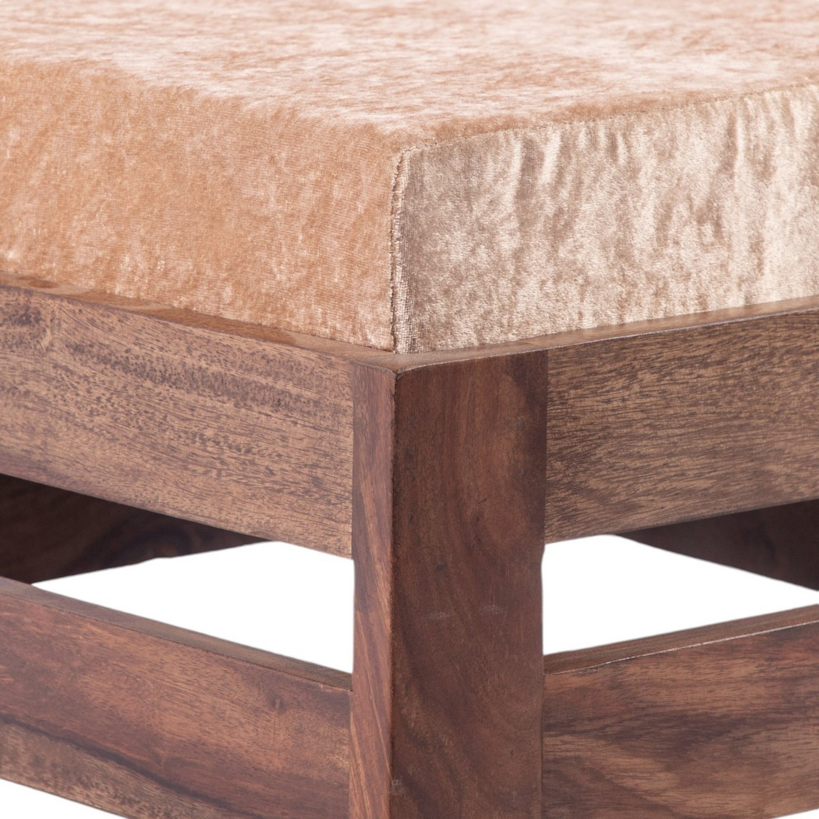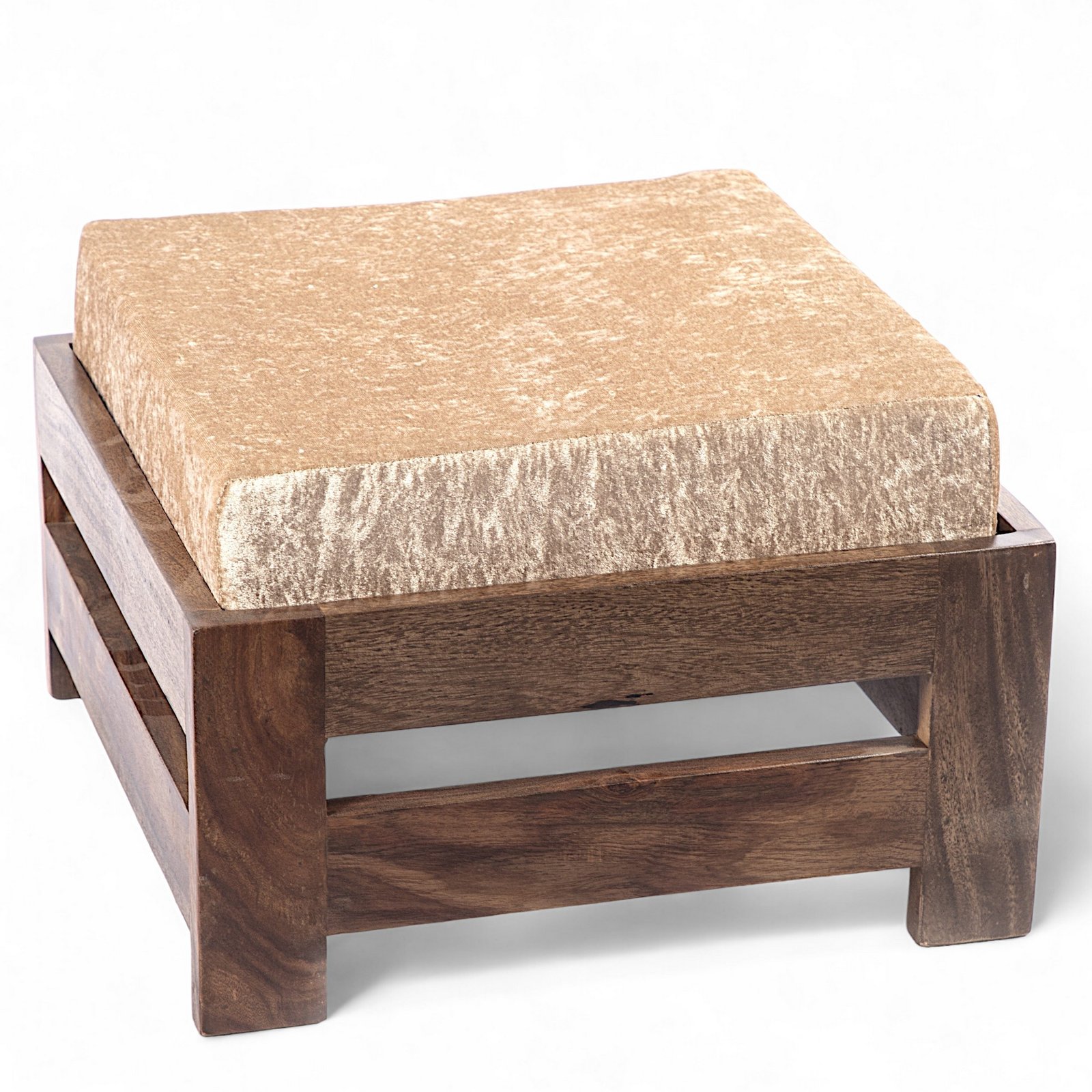 Ikiriya Amber Sheesham Wood Contemporary Square Foot Stool in Teak Finish with Beige Sparkle Velvet Cushion