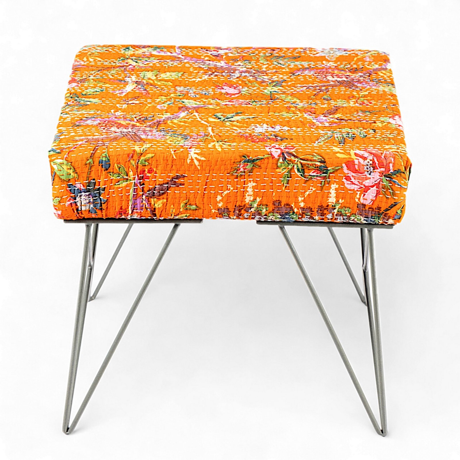 Ikiriya Asansol Sheesham Wood Mid Century Square Stool with Metal Legs in Bird Print Orange Kantha Upholstery
