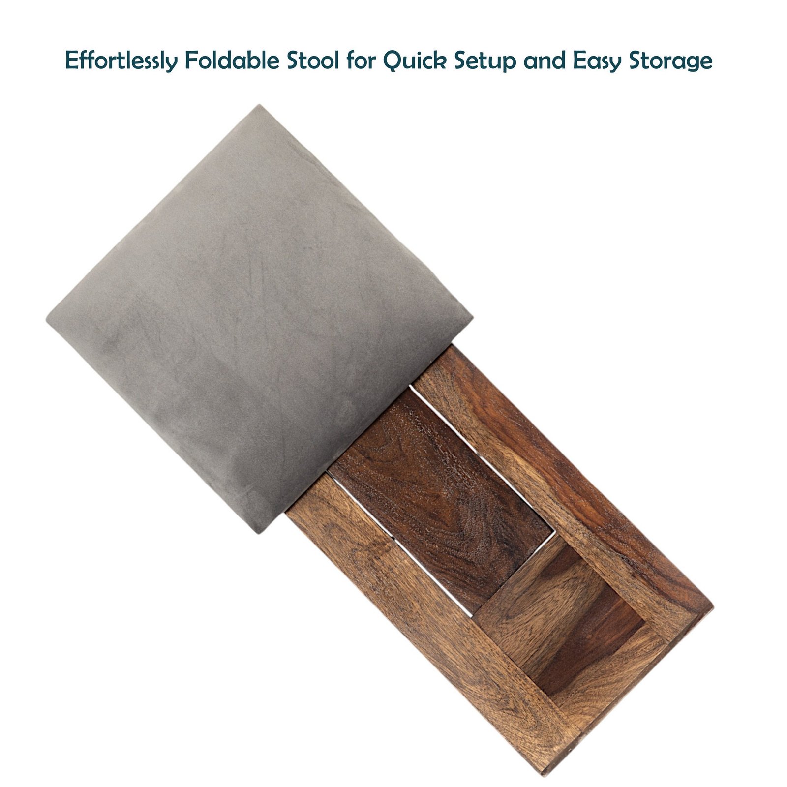 Ikiriya Dayton Sheesham Wood Accent Square Foldable Stool in Iron Grey Velvet Upholstery