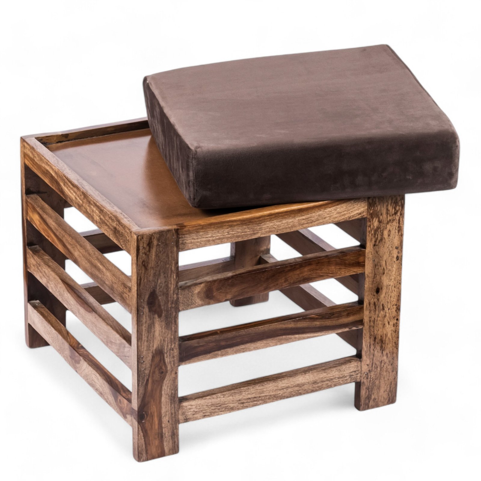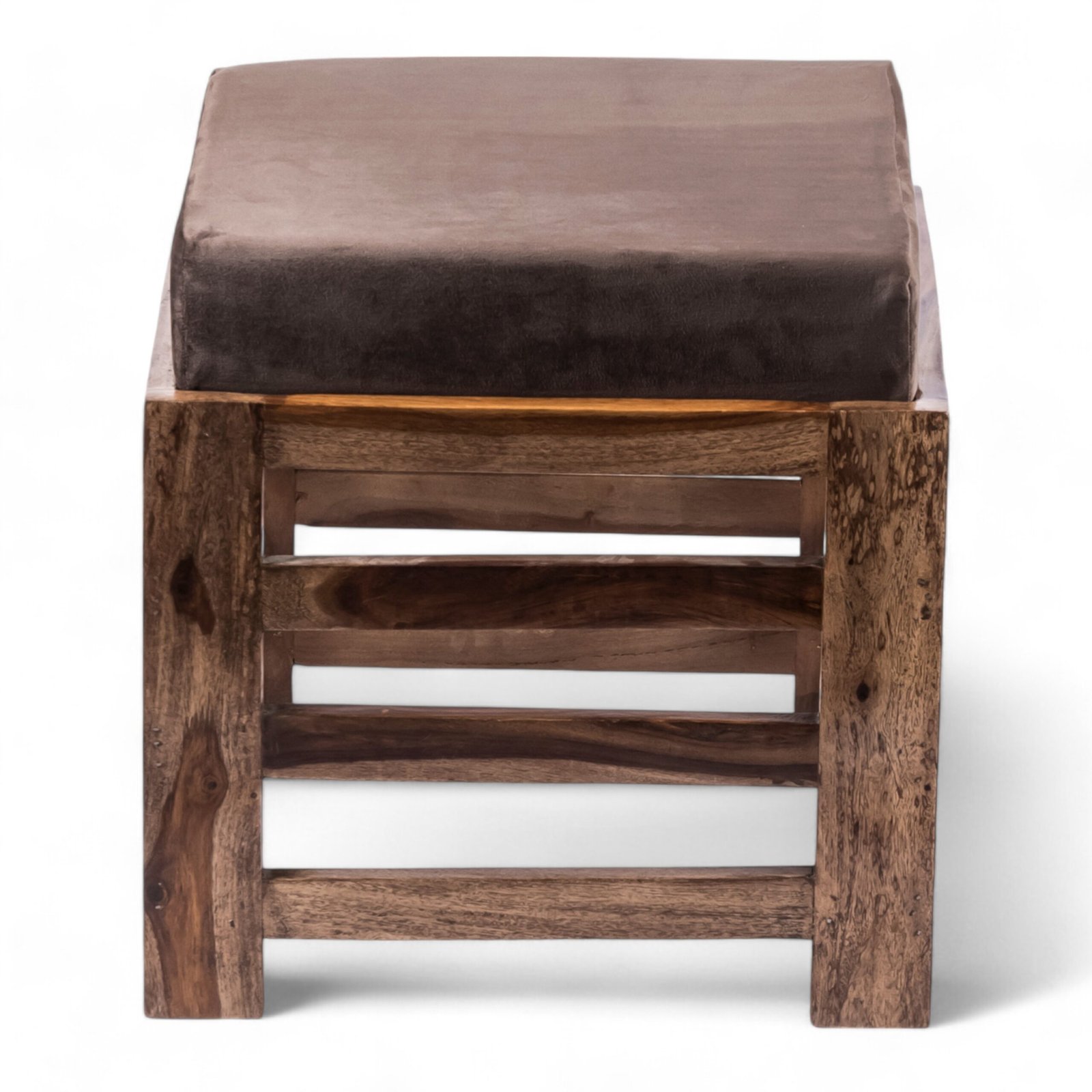 Ikiriya Houston Sheesham Wood Contemporary Square Stool in Teak Finish with Cedar Brown Velvet Cushion