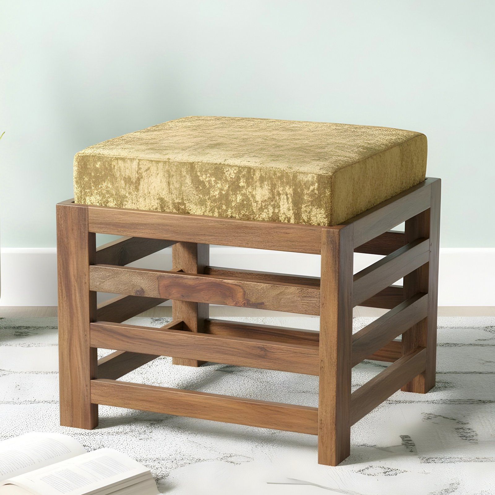 Ikiriya Houston Sheesham Wood Contemporary Square Stool in Teak Finish with Green Sparkle Velvet Cushion
